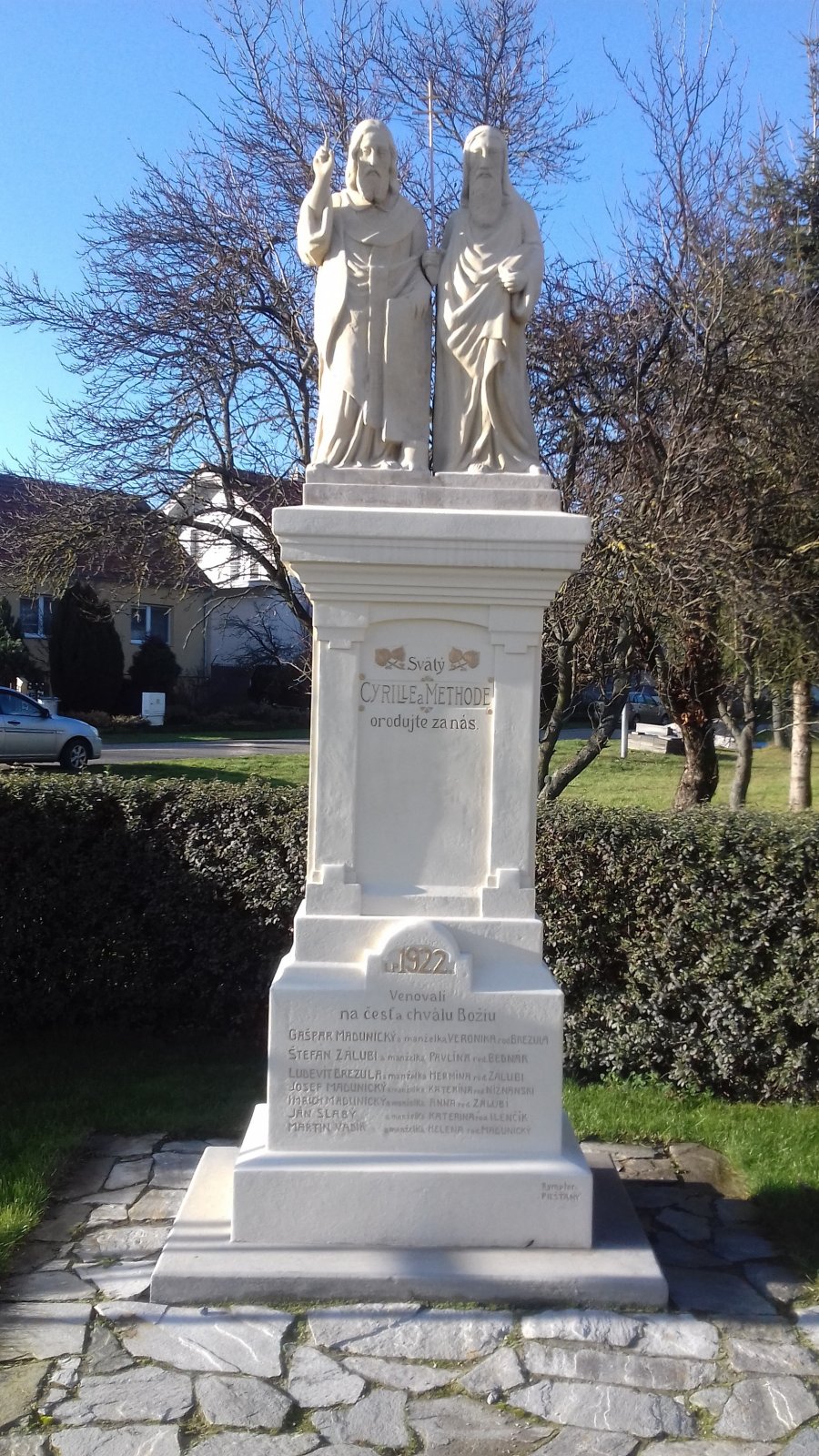 Začnime prehliadou kamenného pomníka sv. Cyrila a Metoda. Pomník je z roku 1922, je dielom piešťanského kamenára Václava Rykplera. Pomník pôvodne stál pred budovou školy, na dnešné miesto ho premiestnili v roku 1947. Okolo pomníka bola v čase mojej návštevy zelená tráva, štyri veľké kvetináče dávali tušiť, že v čase jarnom a letnom sú vysadené farebnými kvetinami.