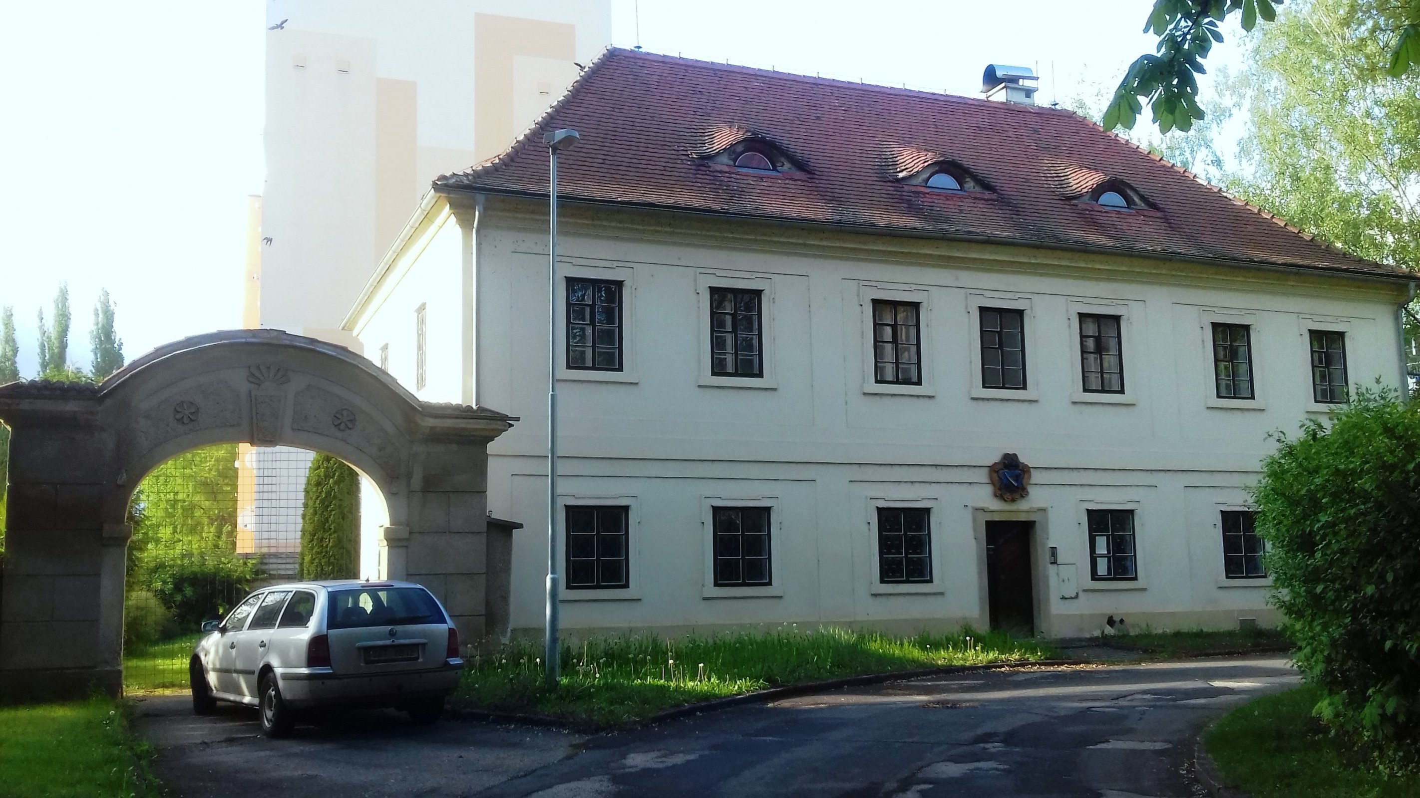 Vľavo u budovy je vjazdová brána v hornej časti zaklenutá do zdobeného oblúka pokrytou taškou. Areál kostola so sochami a farou sú hodnotnou dochovanou neskorobarokovou pamiatkou dnes už takmer neexistujúceho historického jadra mesta.