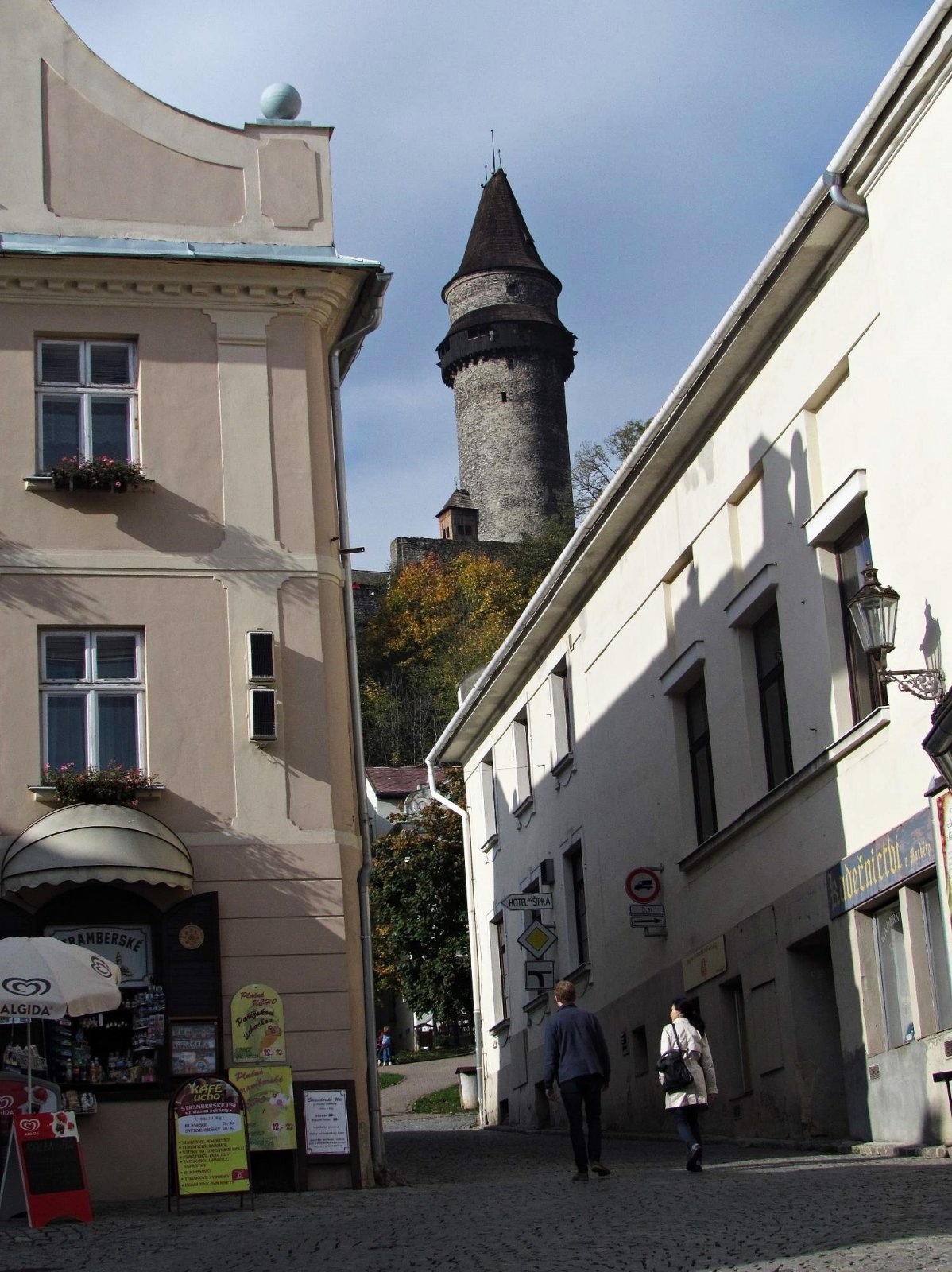Všude se píše, že je hlavním dominantou náměstí kostel sv.Jana Nepomuckého, který stojí na jeho horním konci, ale tady si dovolím oponovat. Jednoznačným vítězem v tomto klání je ta „světská“ kulatá věž, která na něj sice shlíží z povzdálí až z hradního návrší, ale díky své výšce je naprosto nepřehlédnutelná. To ona nejvíc přitahuje naše zraky a je nejenom hlavním objektem viděného panorámatu, ale i strážcem rynku... a vlastně i celého Štramberka.