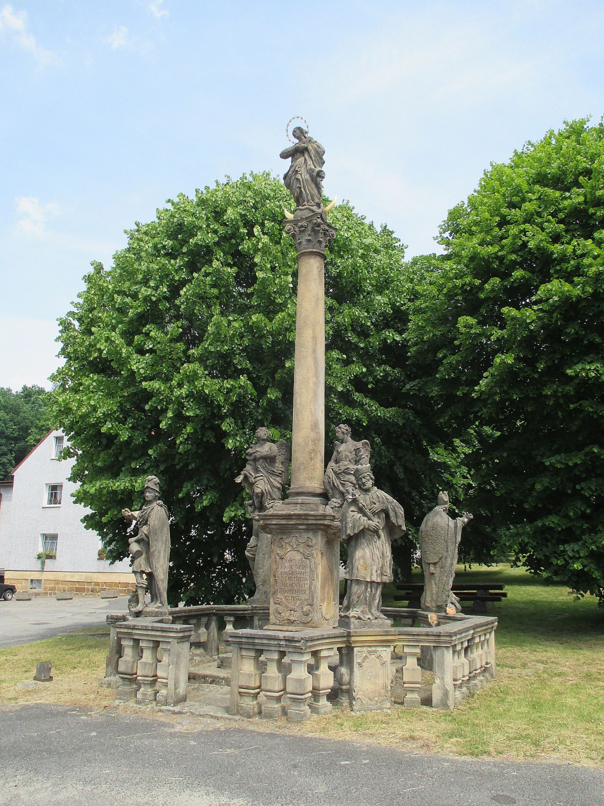 Dominantou náměstí 5. května je morový sloup. Postaven byl roku 1682 a to na počest vyhnutí se morové epidemii roku 1680. Sloup se sochou Panny Marie byl roku 1721 doplněn o sochy dvou andělů z od K. Steyera. V roce 1726 byly přidány na zábradlí sochy čtyř světců a to sv. Jana Nepomuckého, sv. Floriána, sv. Šebestiána a sv. Prokopa.