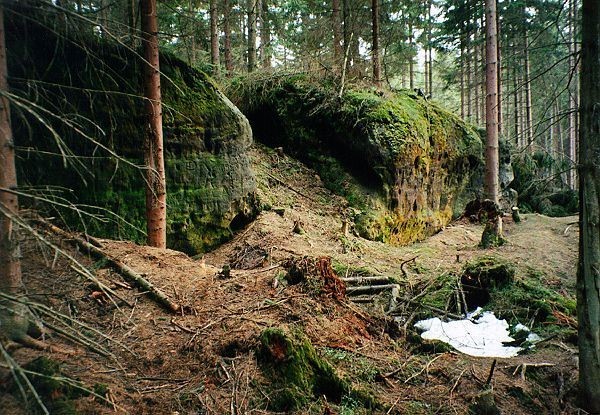 Pomístním názvem Stříbrné doly se původně označovalo nevelké území asi 0,5 km jižně od Hraničního rybníka, později byl ale tento název rozšířen na poměrně rozsáhlé zalesněné území mezi silnicí z Dolního Falknova na Novou Huť a severními svahy Velkého Buku a Popelové hory. V této oblasti jsou nepravidelně rozptýlené mělké jámy a rýhy, o jejichž původu se neví téměř nic. Je možné, že se jedná o pozůstatky po starém dolování železné rudy, k jejímuž drcení měl sloužit hamr nedaleko Hraničního rybníka. Jejich vznik je orientačně zařazován na přelom 15. a 16. století, i když není vyloučeno, že jsou ještě starší. V místě, k němuž se označení Stříbrné doly vztahovalo dříve, je nedaleko železniční trati v lese ukrytá nevelká strž, v níž jsou do několika skal vytesané různé symboly, nápisy a letopočty. Pod skalami jsou patrné staré jámy a rýhy, které by mohly být pozůstatkem po dolování. Ve starší vlastivědné literatuře se odtud uvádí i štola, jejíž existence je však jen málo pravděpodobná. Ojedinělé rytiny se nacházejí i na dalších skalách v okolí. Nejvíce znaků je vytesáno do trojice skal na jižní straně strže. Najdeme mezi nimi například hornická kladívka s písmeny KH a letopočtem 1769 nebo zajímavou rytinu raka, ale také iniciály B:F:M s letopočtem 1748, které jsou (s letopočtem 1741) i na nedaleké Valdštejnské skále. Se značnou rezervou musíme brát vyryté nápisy, podle nichž zde bylo nalezeno zlato. Většinou totiž nebylo v zájmu prospektorů hlásat své úspěchy do okolí. Někteří autoři se pokoušejí vyrytá znamení identifikovat jako alchymistické značky nebo znamení starých Vlachů, kteří si jimi podle pověstí označovali naleziště vzácných kovů a drahokamů. Mnohé značky mohou pocházet od tuláků, lesníků, smolařů nebo uhlířů, ale také od vojáků a místních obyvatel, skrývajících se tu před útrapami válek. Autory rytin mohli být i dělníci, kteří stavěli koncem 60. let 19. století údolím Kamenice železnici a některé znaky byly zřejmě doplněny v novější době. Skutečný smysl rytin si dnes můžeme jen domýšlet.