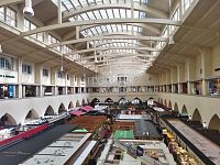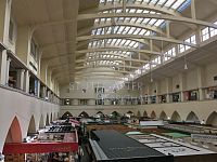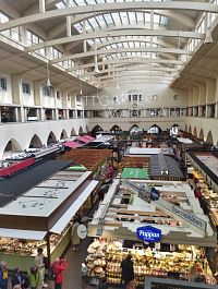 Je zajímavé už to, že zatímco zvenku působí fasáda se secesními arkádami, věžemi a arkýři spíše temně a uzavřeně, interiér tržnice je vzdušný, prosvětlený a – poměrně překvapivě – zcela tu chybí nosné sloupy. Prosklenou střechu totiž nese konstrukce ze železobetonových nosníků. Potěší obvodový ochoz, který poskytuje výhled na ruch mezi stánky.