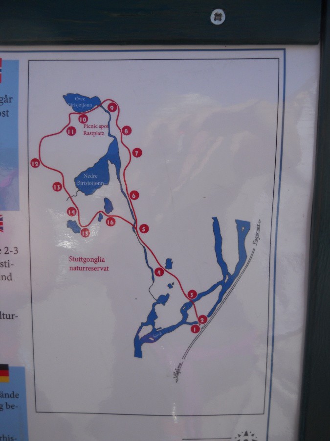 Vlastní naučná stezka je dlouhá 5,5 km, je to pohodlná trasa, kterou zvládnou i děti. Na trase je 15 informační tabulí, kde se dočtete informace o této oblasti. Dozvíte se, že překračujete řeku Sjoa, která vytéká z jezera Sjodalsvatnet (u něho jsme kempovali) a jejíž tok měří zhruba 100 km. Dozvíte se, že zde žijí sobi, jaké bobky tu po nich najdete (na to, jak jsou to velká zvířata, tak bobky mají skutečně malé) a kolik toho denně sní. Prostě spoustu zajímavostí o zdejší přírodě, řemeslech, kultuře i historii. Bohužel už ne v češtině – jen v norštině, němčině a angličtině. Pokud si budete vše číst, počítejte prý s 2 – 3 hodinami.
