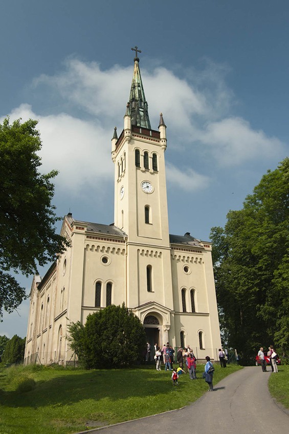 Novou dřevěnou modlitebnu si postavili protestanti hned v r. 1782 již na místě dnešního kostela. O 10 let později byla modlitebna již zděná zatím bez věže. Právě v r. 1848 bylo rozhodnuto o stavbě důstojné svatyně. Původní návrh od J. Appelta z Bialska byl pozdně barokní, ale v průběhu stavby byl architektura pozměněna Ludwigem Försterem. Ten do návrhu vnesl prvky dalších stylů (románské, gotické či orientální). Stavba tedy předznamenává budoucí neogotiku, i když tvarosloví (oblouky, římsy) je spíš románské, ovšem prvotní dojem je skutečně novogotický. Samotná stavba byla zahájena v září 1852, věž byla vztyčena během r. 1856, 26.10. 1856 byly zavěšeny 3 zvony z Wienerneustadtu. Náklady na stavbu nesli převážně místní věřící, kteří si vlastně dobrovolně prodloužili o 10 let robotu. Náklady na stavbu dosáhly 25 000 zlatých. Otevření kostela proběhlo 17.10.1858. Po odsunu německých obyvatel kostel dosti chátral, uvažovalo se i o demolici, k tomu naštěstí nedošlo. Postupně se kostel opravuje, dodnes se naštěstí můžeme pokochat téměř s původním interiérem, pro neznalé bude pohled na postranní galerie, které jsou ovšem v protestanských kostelech běžné. Interiér je v podstatě celý původní, valená klenba je vymalována bez větších ozdob. Na Vítězném oblouku a varhanami jsou německé nápisy. Oltář a ozdobné prvky vznikaly v továrně na kameninu v Hrušově podle návrhů Eduarda Würtembergra. Kovářské práce vyvedl místní mistr Leopold Zeisberger.