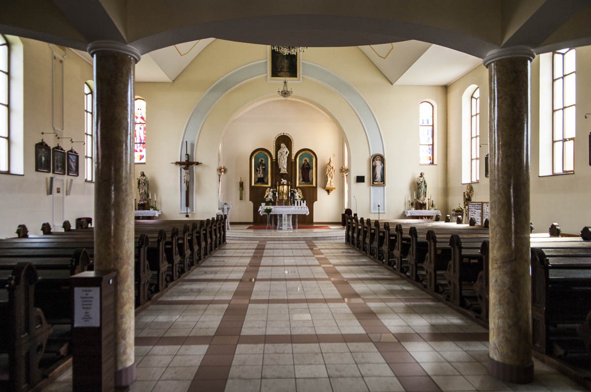 Ten navrhl kostel poměrně tradičního vzhledu. Jednolodní stavba obdélníkového půdorysu je zastropen nepravou valenou klenbou. Klenutý strop je i v přistavěný presbytář. Vnitřní omítky jsou hladké, strop má obdélníkový vzor. Před hlavní loď je předsunutá kvadratická věž s bočními schodišti na kruchtu. Zpěvácké tribuně dominují dvoumanuálové varhany firmy Rieger a Klos. Ty jsou dnes zřejmě největší atrakcí kostela. Velkolepý zvuk vynikne i při koncertech převážně duchovní hudby. Většina poměrně skromné vnitřní výbavy pochází z původního kostela.