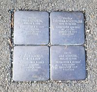 Právě až z té doby máme na kraji města židovský hřbitov. První kameny zmizelých v Šumperku byly instalovány na Hlavní třídě (před tím Schillergasse), postupně přibyly další, takže hned pět takových kamenů najdeme dnes na Fialově ulici u č. 12, několik dvojic kamenů na Hlavní tř. 2, 7, 10. Jeden na třídě Gen. Svobody 6 a další tři u paláce Schönberg na dnešním náměstí Republiky (nároží ulic Langrovy a Lužickosrbské). Hned čtyři kameny jsou k vidění na Blanické ulici v tzv. České čtvrtí (od centa za kolejemi). Je to tedy mimo centrum, což dokládá, že v modernější (a šťastnější) době se vyznavači judaismu usazovali i jinde (nechtěl jsem použít přímo termín Židé).