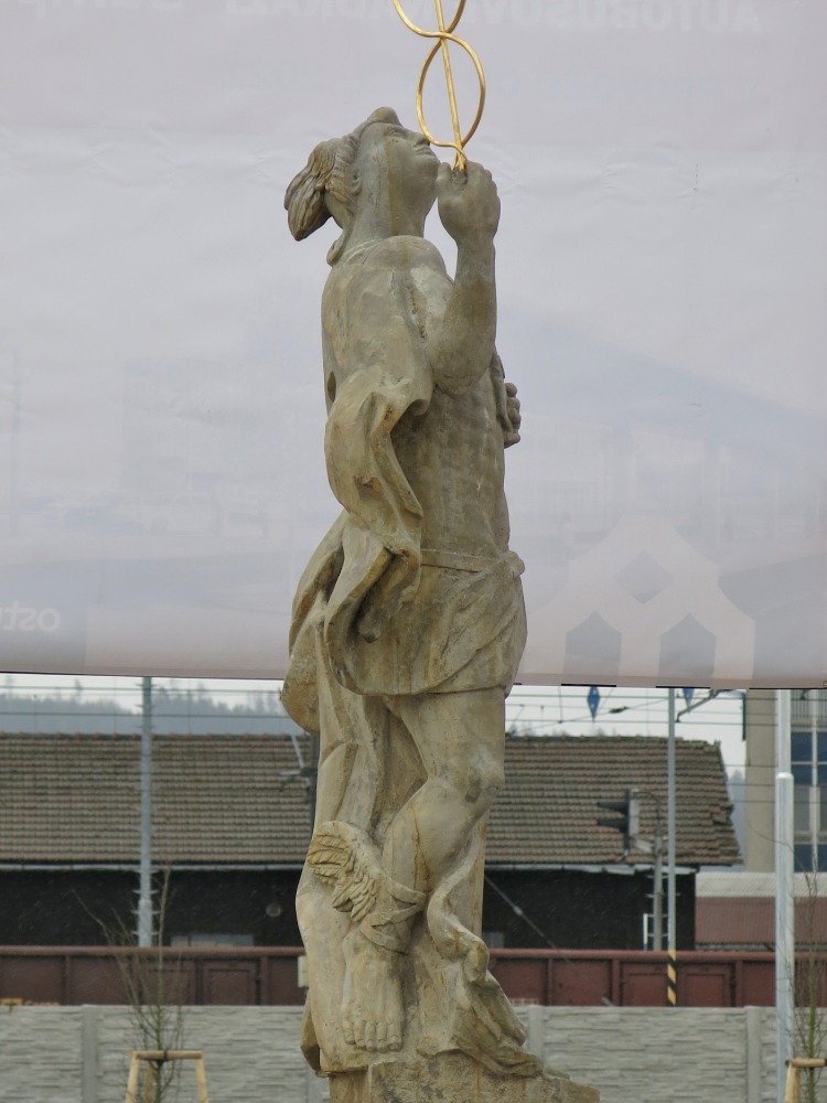 K nebesům hledící plastika boha s okřídlenými dolními končetinami je původním originálem, vzhledem k různým poškozením však lehce doplněným. Nová je tak jedna ruka, část soklu a kopie zlaté hole. Mezi samotnou stojící postavou a novodobou základnou se nachází část někdejší kašny s maskaronovými chrliči.