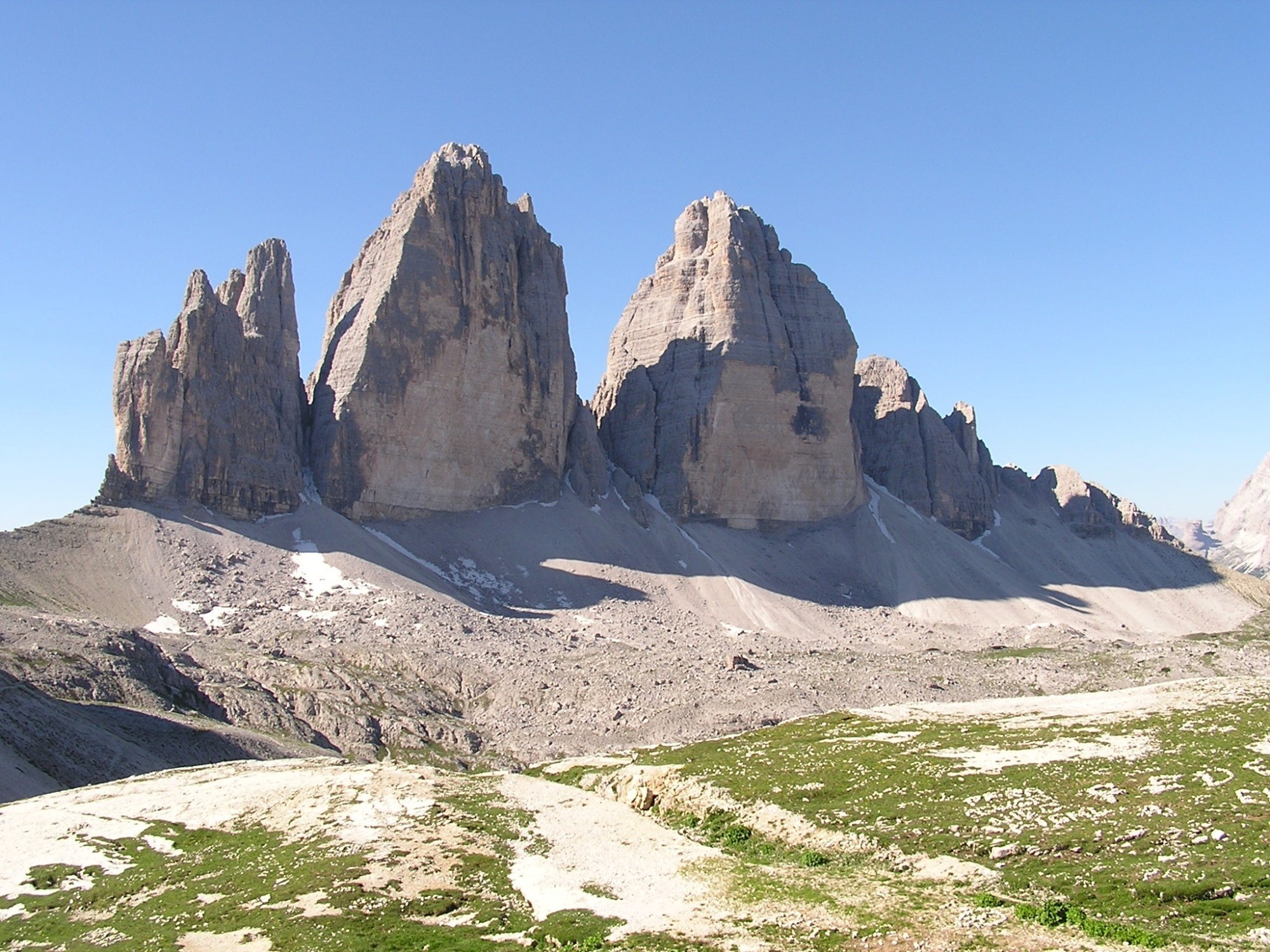 Tři obří skalní věže tyčící se kolmo nad suťovým polem se pro svojí krásu a ojedinělost staly symbolem Dolomit. Jde o věže Cima Grande /2949 m/, Cima Ovest /2973 m/ a Cima Piccola /2875 m/. Vysoké a často převislé severní stěny jsou velkou výzvou pro horolezce. Nejvyšší věž byla poprvé zdolána v roce 1869.