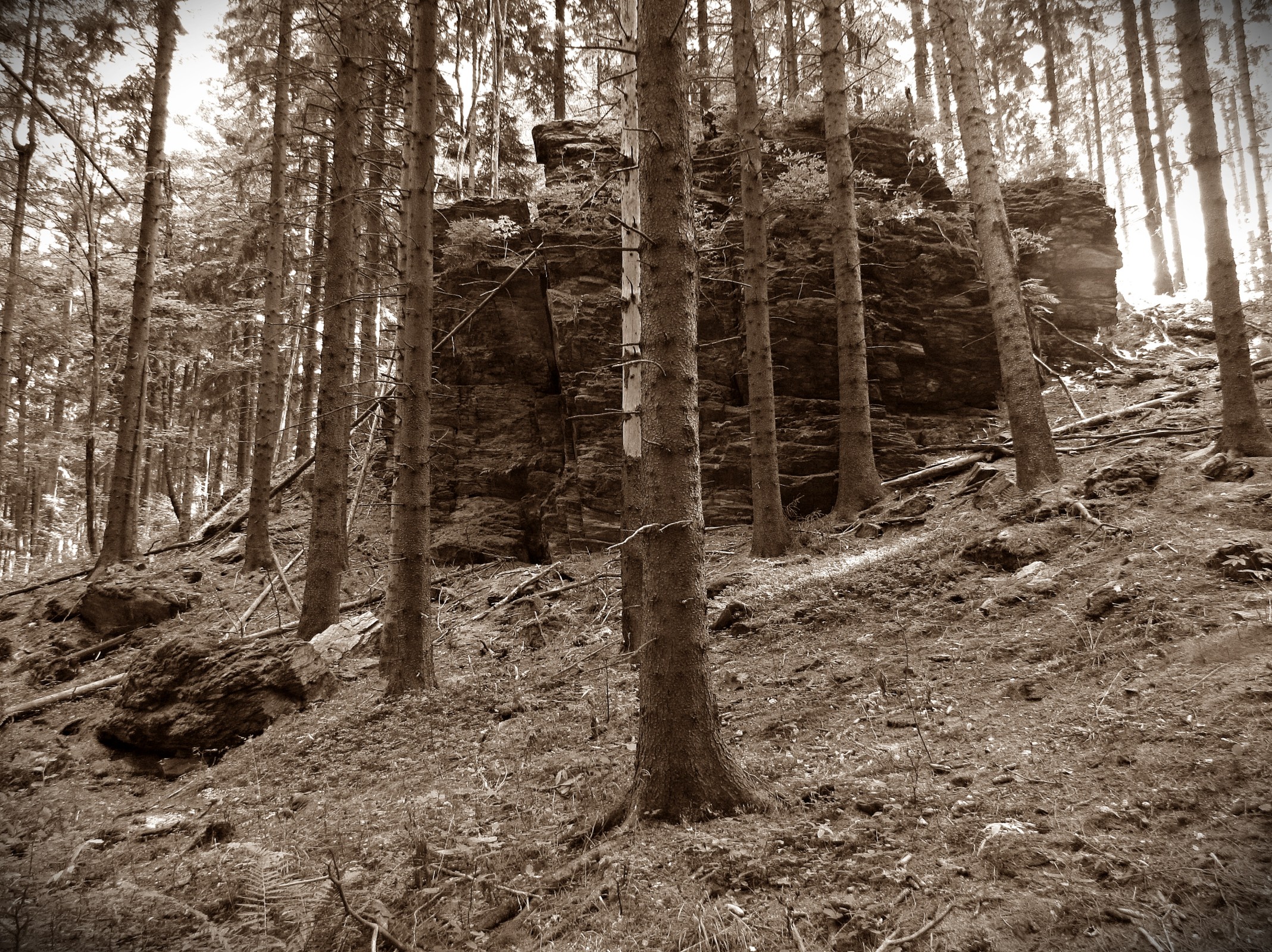 Přímo do přírodní rezervace nevede žádná cesta, natož turistická trasa. PR zaujímá vrchol a severní a západní svahy zalesněné kóty 774 m, která je od jihu oddělena Čertovým sedlem od vrchu Pastviny a směrem k severu je vzdálena asi 400 m od Horní Moravice. Z obce do svahu s pastvinami vybíhá polní cesta a na jednom místě je od ní začátek rezervace vzdálen pouhých sto metrů. My jsme okolo rezervace procházeli při naší výpravě z Rýmařova-Janovic přes vrch Pastviny do Nové vsi a já samozřejmě neodolal a udělal si do její střední části menší odskok. Lesní svahy jsou zde bohužel místy zarostené tak, že jsou až neprůchodné, ale právě tady jsem narazil na část starého důlního díla. Kdo umí dobře číst v terénu, ihned pochopí, že ty propadliny a příkopy zde nevznikly náhodou, což mi vzápětí potvrdily dva nezajištěné vstupy do podzemí. Jak už jsem se zmínil, rezervace se rozkládá ve skalnatém terénu a já se tu potěšil i pohledem na větší, nejméně deset metrů vysoké rulové skalisko, které už tak tajemné lokalitě dodává ještě tajemnější nádech. (Různých skalních výchozů je v rezervaci pochopitelně víc. Ale ty štoly se zamřížovanými vchody, které lze vidět na několika fotografiích na netu, se zřejmě nacházejí až v nejsevernější části rezervace...)