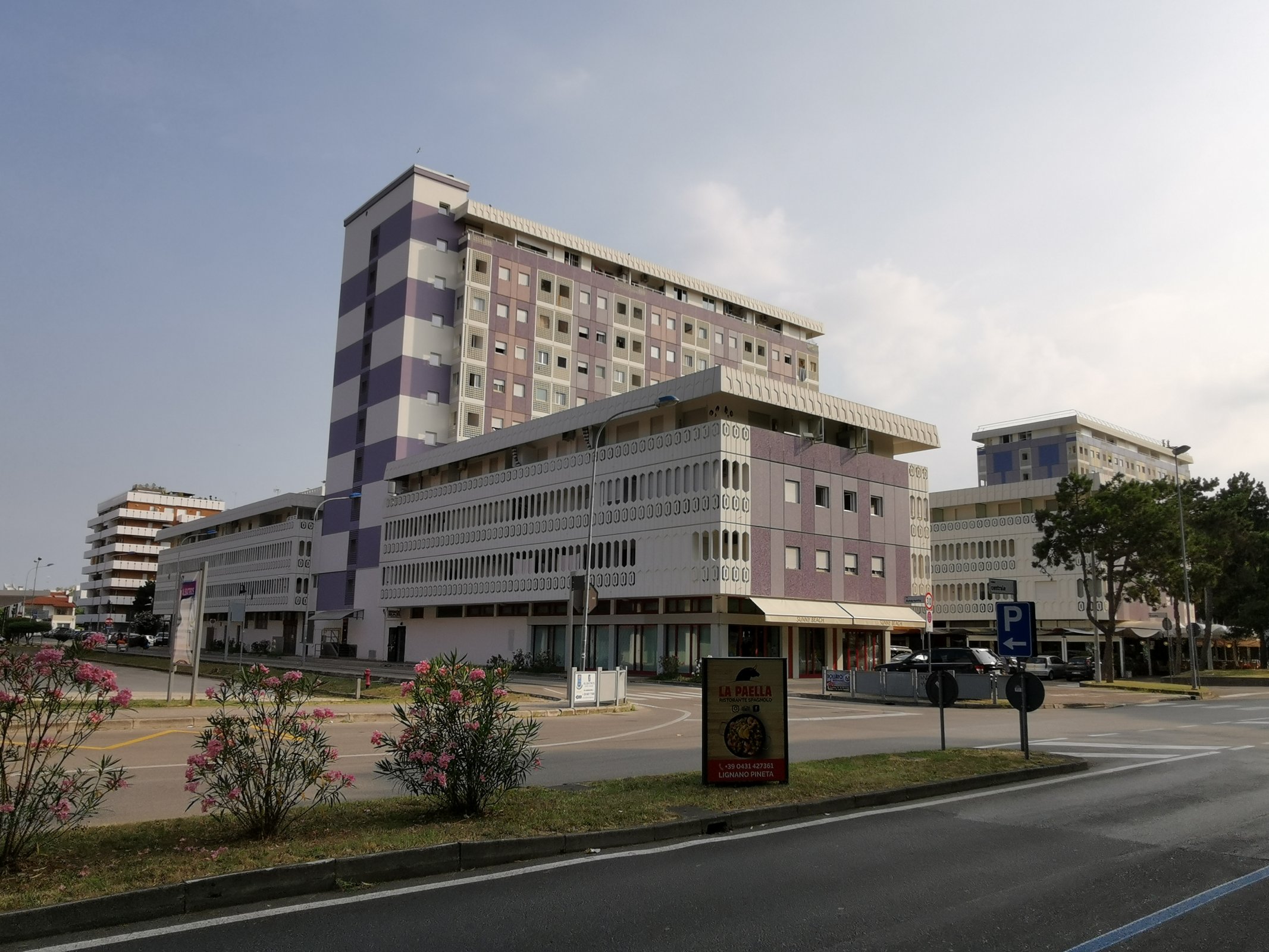 My sme bývali v časti na konci poloostrova zvanej Sabbiadoro. Pri prechádzkách po letovisku ma zaujalo niekoľko stavieb. Najskôr ma zaujal obytný komplex budov - panelákov. Biele steny boli spestrené fialovými a modrými farbami. aujímavé boli aj balkóny - terasy, ktoré boli skrášlené akoby "ornamentami". Tipovala som to na 60-70 roky minulého storočia. Mám rada tieto "retro" domy.