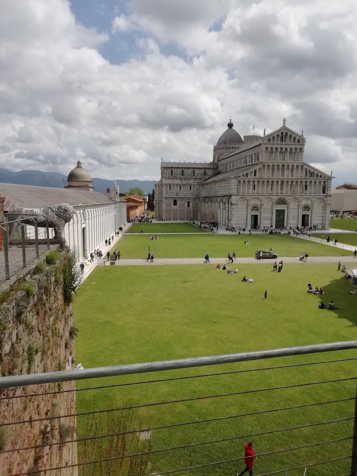 pohľad na časť mestských hradieb, krstiteľnicu a dlhá biela budova je Campo santo  autor: bublinko2