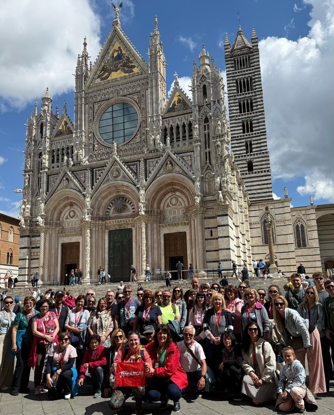 Veľmi sa nám páčila aj hlavná fasáda katedrály, pred ktorou sme sa vyfotili celá naša skupina. Fasáda je zdobená v štýle toskánskej gotiky a tvorí jednu z najkrajších fasád v Taliansku. Hlavnou dominantou exteriéru i interiéru je čiernobiele obloženie, ktoré sa nachádza najmä na stĺpoch. Čierna a biela farba sú typickým znakom Sieny. Nad vchodmi do katedrály sa nachádza množstvo sôch svätcov, prorokov a apoštolov od významných sochárov 13. a 14. storočia, vrátane Giovanniho Pisana.