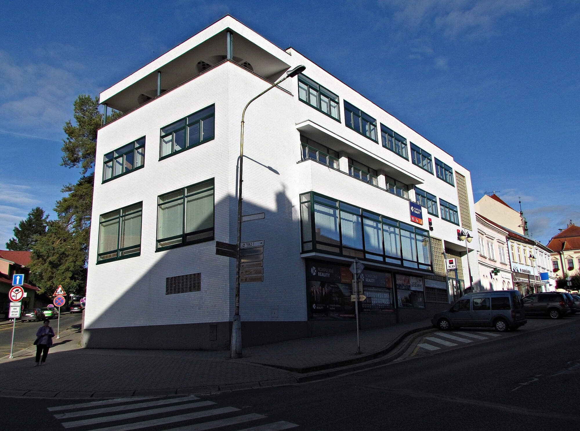 Jedná se o třípatrový a dvoukřídlý objekt, přičemž hlavní křídlo je souběžné se zástavbou rynku a boční křídlo postavené na něj kolmo trčí do ulice Dvořáčkovy. Každého nepochybně zaujme pohled na jeho zajímavou členitou podobu s velkými okny (a v nejhořejším patře s terasou) a také na tu zvláštní fasádu, která byla obložena bílým opaxitem.