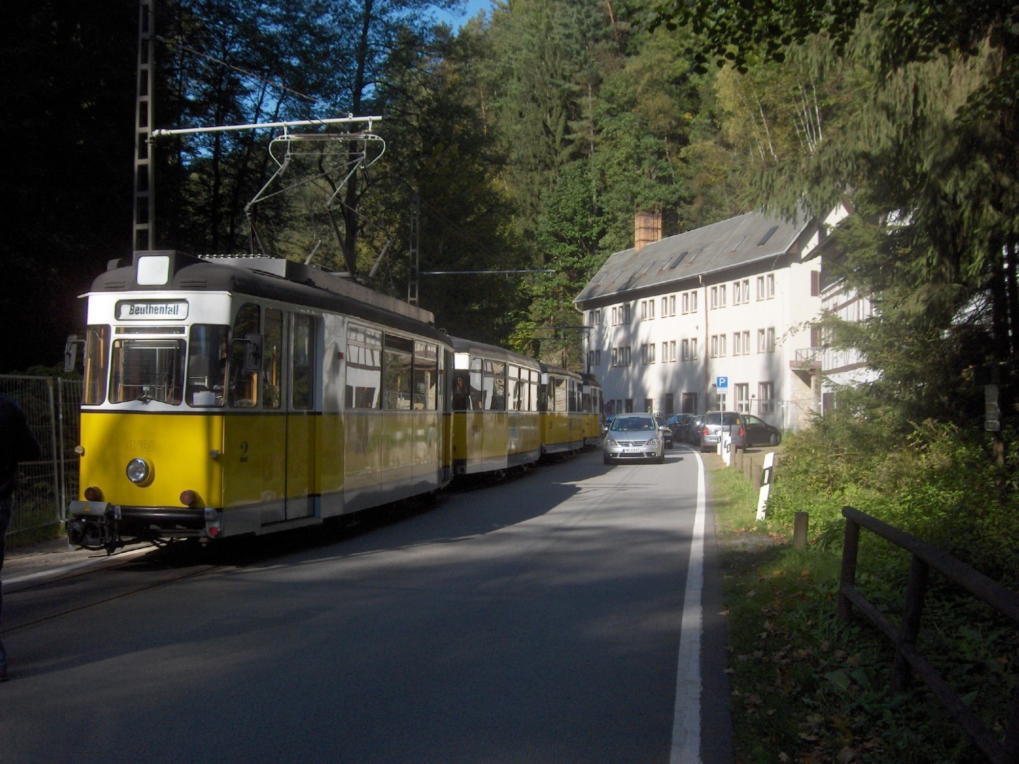 Původní konečná stanice na nábřeží v Bad Schandau byla v roce 1963 zrušena a byla posunuta směrem do údolí do městského parku. Po povodni není ještě opravený poslední úsek a tak tramvaj končí v předposlední stanici Bauthenfall.
