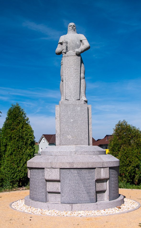 Pomník vskutku monumentální kvality objevíme v západočeské Třebeni u křižovatky místní a hlavní komunikace. Pomník tvoří odstupňovaný kruhový podstavec se vsazenými kamennými deskami. Na nich objevíme výčet místních padlých z období Velké války 1914–18. Jména jsou bohužel obtížně čitelná. Podstavec se zužuje v jehlancovitém nízkém sklonu ke kruhoví plošině, na které spočívá kvádr s ustupujícími nárožími. Na nich je umístěná až hrozivá socha středověkého bojovníka v brnění. V pravé ruce svírá jílec meče, levá ruka je opřená o štít.