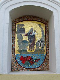 Boží muka jsou nahoře kryta červenými taškami a ze středu stříšky vystupuje drobný kříž.