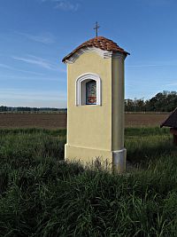 Výklenková kaplička má podobu žlutě omítnutého trojbokého pilíře, na každé straně s bíle olemovanou nikou s malovaným obrázkem, doplněným kol dokola mozaikou a květinami. Na prvním je zobrazeno ukřižování Ježíše Krista, na druhém Panna Maria Hostýnská a na posledním sv.Vendelín – patron pastýřů, sedláků, polí a stád.