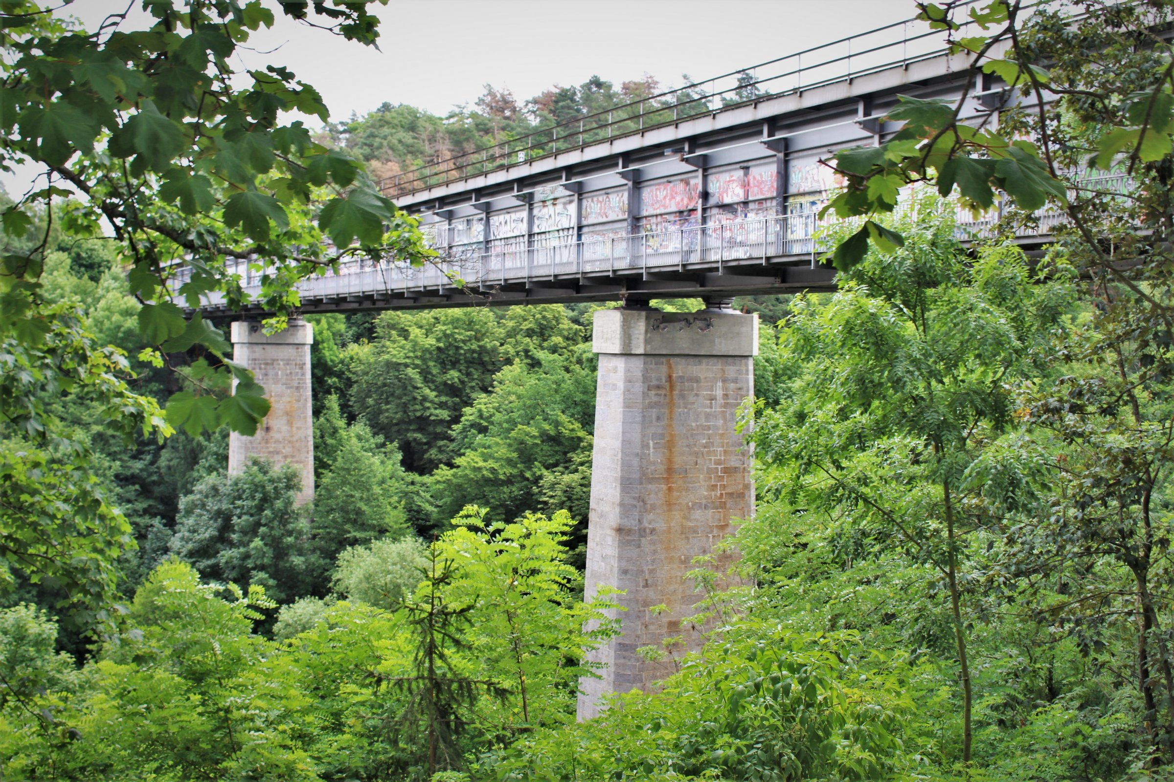 Tento dominantní železniční most na jednokolejné trati 240 Brno-Jihlava překlenuje celé Libušino údolí, pod ním protékající Stařečský potok a Koželužskou ulici.
