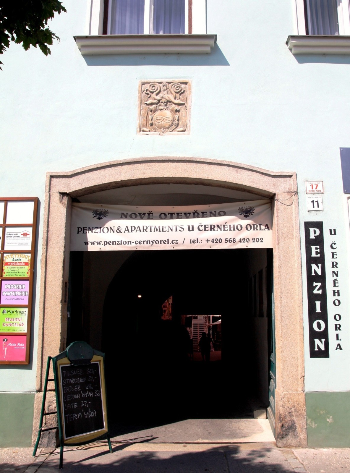Nachází se na hlavním Karlově náměstí. Přízemím v jádru renesančního domu dnes vede průchod na lávku přes řeku Jihlavu směřující do židovské čtvrti. Na průčelí domu je umístěn velký znak lazebníka Viktorina Bradky s letopočtem 1580. Ve zdejší hospodě U Černého orla měl v roce 1742 po osm dní nocovat pruský král Bedřich Veliký, když za války o rakouské dědictví pobýval v Třebíči. Dodnes objekt funguje jako ubytovací a stravovací zařízení, je zde pension. Venkovní částí restaurace se dá projít až k řece na navigaci a po lávce přejít na druhu stranu do židovské čtvrti.