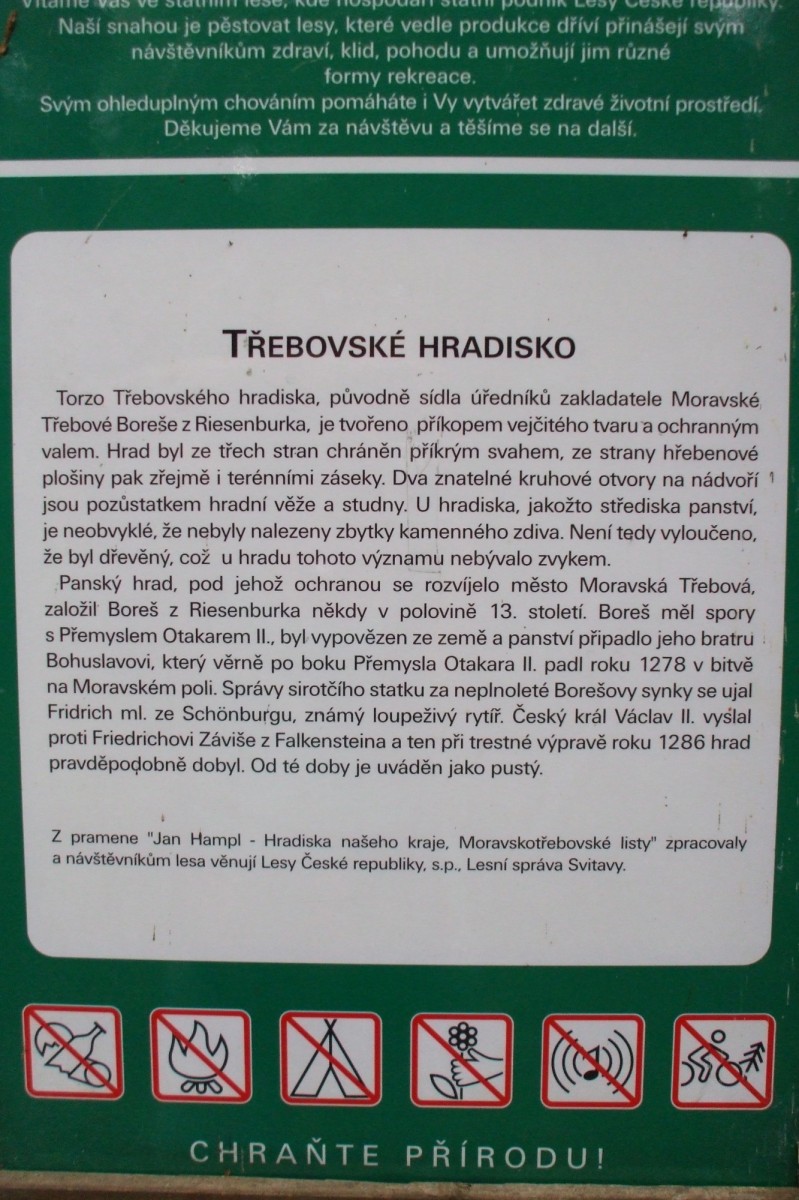 Stále ještě dobře zachovaný reliéf hrádku leží na osamělém vysokém kopci severovýchodně nad Moravskou Třebovou. Nejvyšší bod kopce s výškou 551 m n. m je úzkou šíjí spojený s o několik metrů nižším výběžkem.Ostatní strany jsou hodně strmé a dokud tu nebyl les, byl výhled do širokého okolí po třech stranách opravdu nádherný. Kolem probíhá příkop o šířce od 8,5 do 12,5m a hloubkou kolem 3 metrů vymezený okružním valem. Úzká šíje spojující areál s vrcholem kopce je přerušena náznaky příčného příkopu a valu.