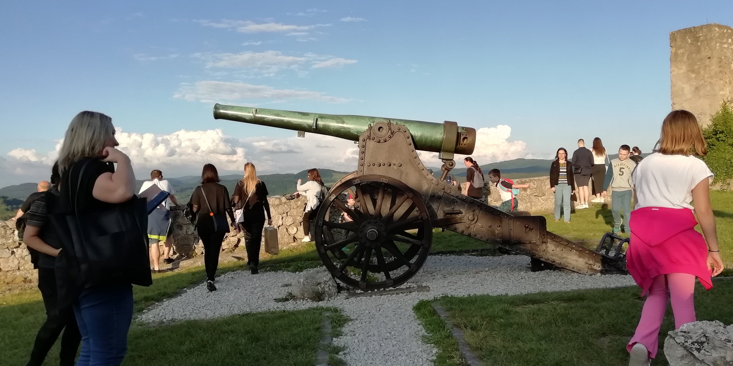 pohľad na Horný hrad z miesta kde býva v letných mesiacoch pódium a na ňom sa konávajú vystúpenia rôznych umelcov