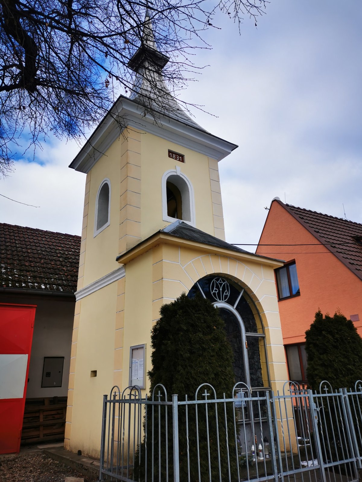 Zvonička má v hornej časti otvorené okná pre zvuk zvona v hornej časti zaklenuté do oblúka. Nad oknom od ulice je letopočet 1831. Strecha je v tvare zaobleného ihlana ukončená je krížom. Zvon sa rozoznieva každý deň večer, pred svätou omšou a pri úmŕtí.
