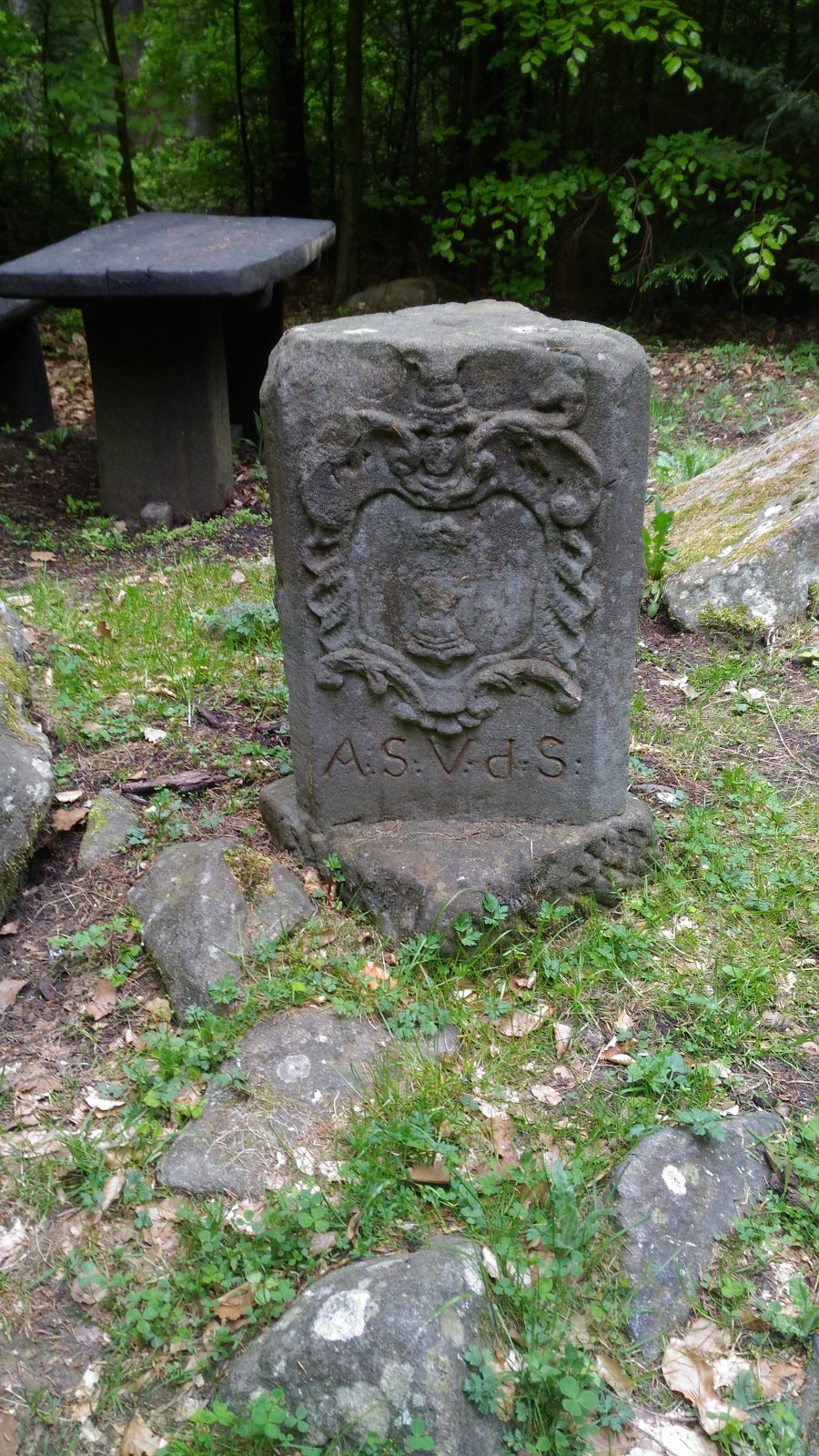 Na sloupku jsou vytesány znaky těchto tří panství.