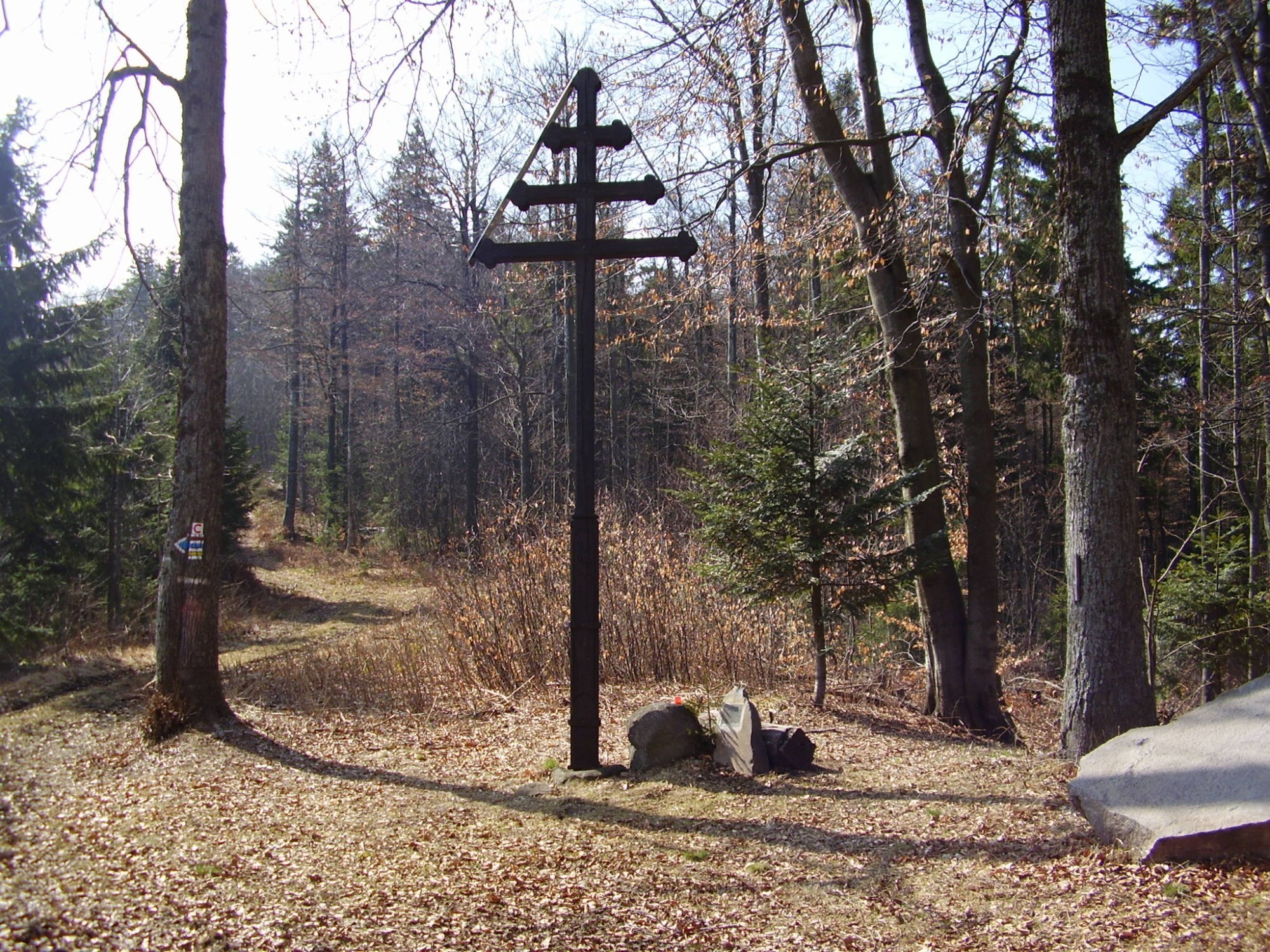 Unikátny krucifix,ktorý sa nachádza v sedle Tri kríže bol postavený v roku 1834. Po zničení v roku 1894 bol znova obnovený.V roku 2020 ho niekto zrezal a o rok neskôr bol znovu postavený.Pri peknom počasí sa naskytne pekný výhľad na Fatru.Je tu možnosť si pri výhľade posedieť na lavičkách.