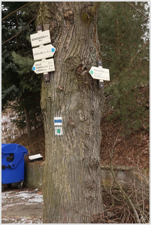 Turistický rozcestník potkáme přímo u železniční zastávky Bohousová. Procházejí tudy tyto turisticky značené trasy: