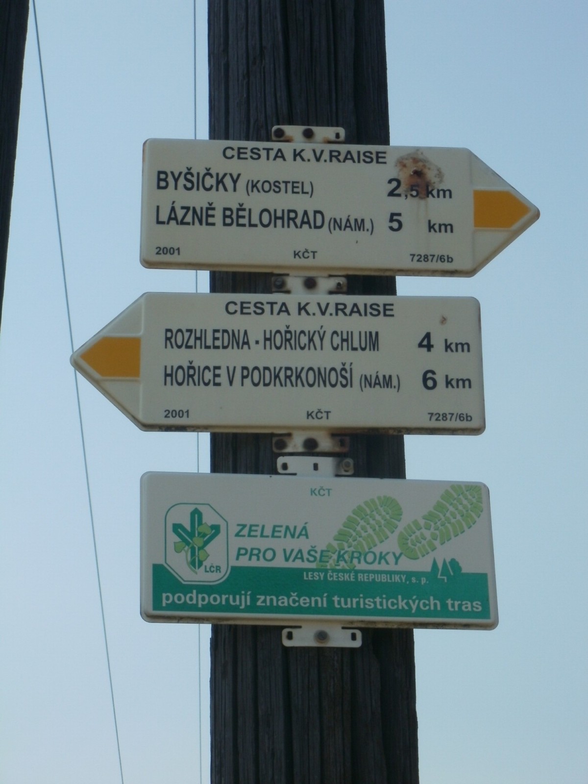 Turistický rozcestník, který se nachází v osadě Černín, ukazuje turistům cestu po žlutě značené Cestě K.V.Raise ve směru Nová Paka - Hořice.