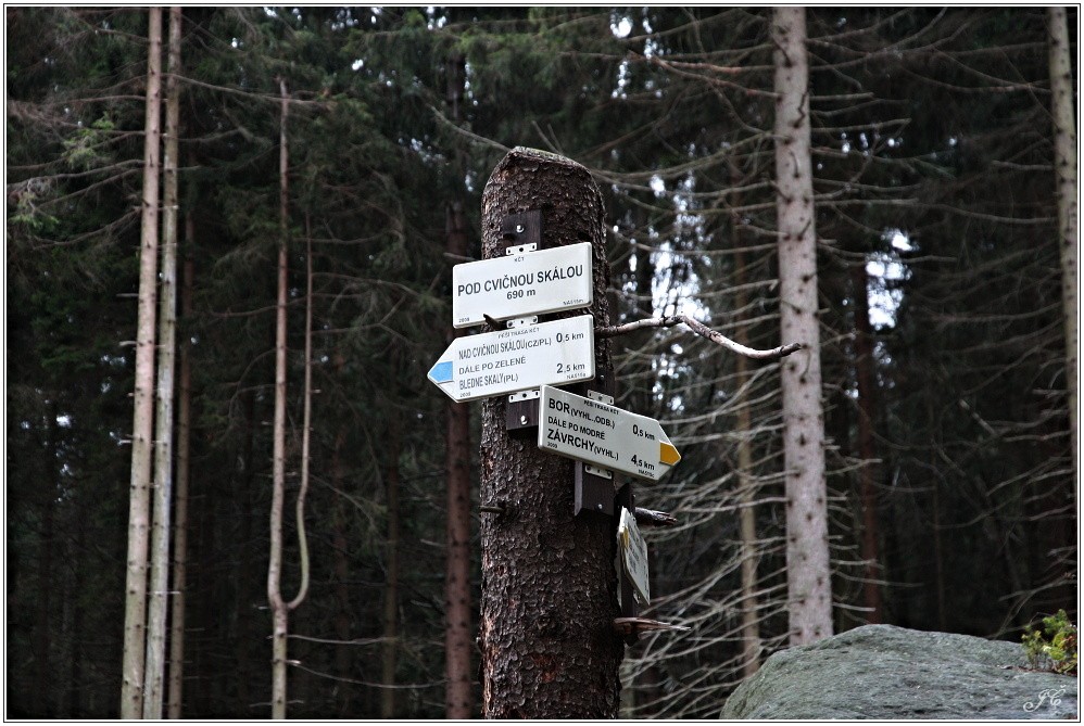 žlutá JZ směrem - rozcestí Bor, odbočka k vyhlídce. Navazuje modrá značka z Machova na Bor, Bukowinu Klodzkou, Pstraźnou a Závrchy.