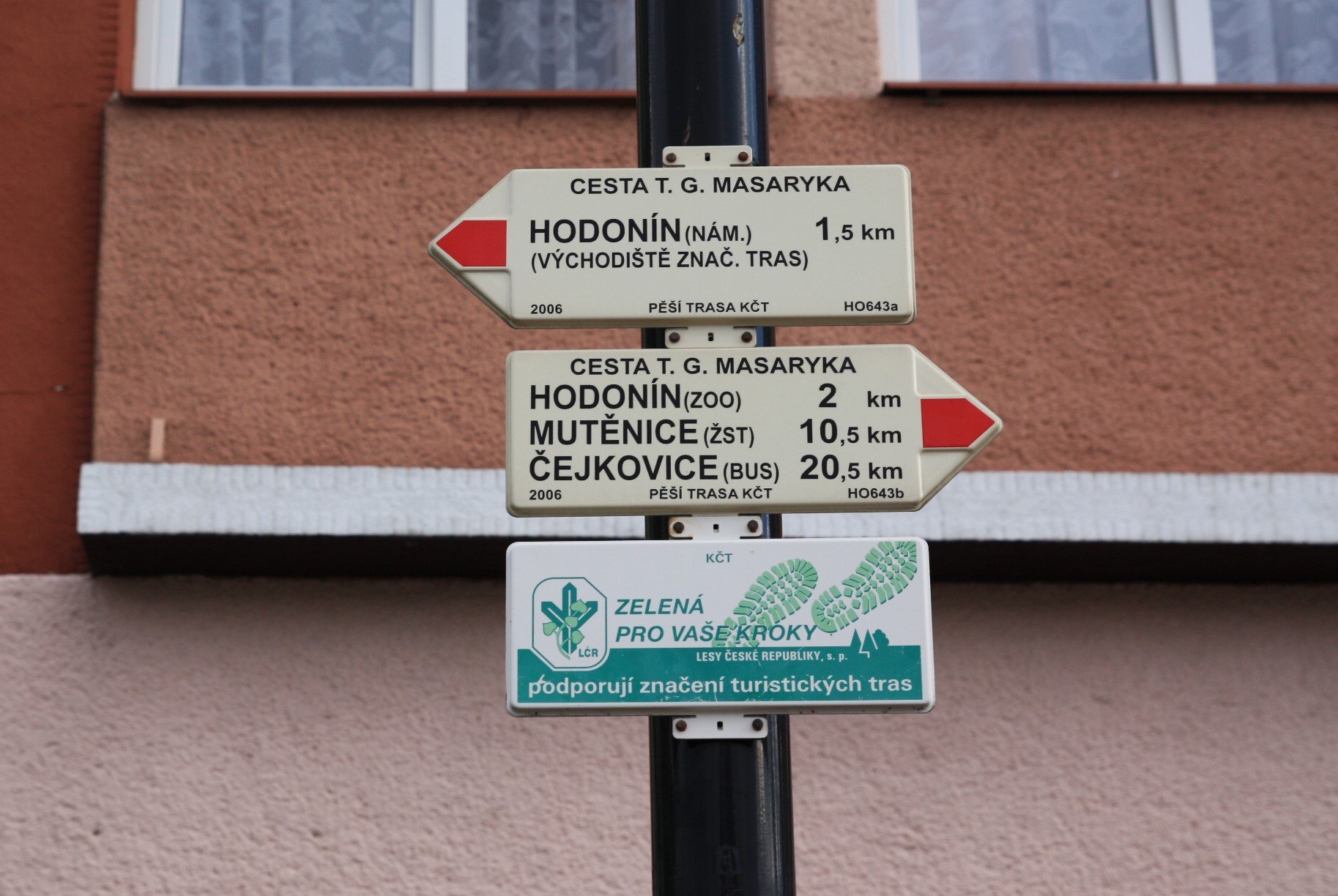 Nachází se na ulici Wilsonově před železniční stanicí u hotelu Grand. Prochází tudy červeně značená turistická cesta. Ta vede jedním směrem k Červeným Domkům a Zoologické zahradě, pokračuje Hodonínskou Dúbravou na Zbrod a odtud dále kolem rybníků až do Mutěnic. Jedná se o začátek dálkové trasy "Cesta T. G. Masaryka". Opačným směrem pokračuje pak ulicemi Hodonína na Masarykovo náměstí, kolem muzea a Bratislavskou ulicí dojde až ke státní hranici se Slovenskem. Zde u rozcestí Most cez Moravu se napojuje na okružní zeleně značenou trasu vedoucí do Holíče.