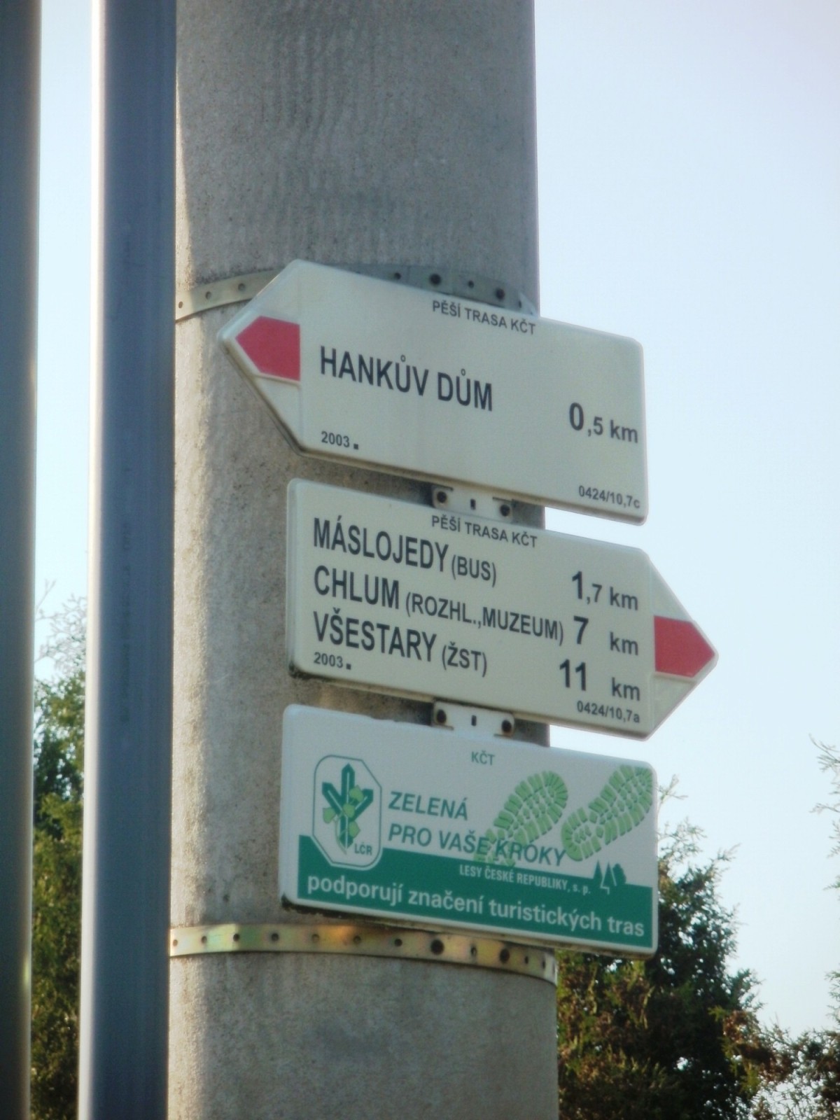Turistický rozcestník, který se nachází u autobusové zastávky v Hořiněvsi ukazuje turistům cestu po červené značce ve směru Hořiněves Hankův dům - Máslojedy, les Svíb, bojiště na Chlumu, Všestary žst.