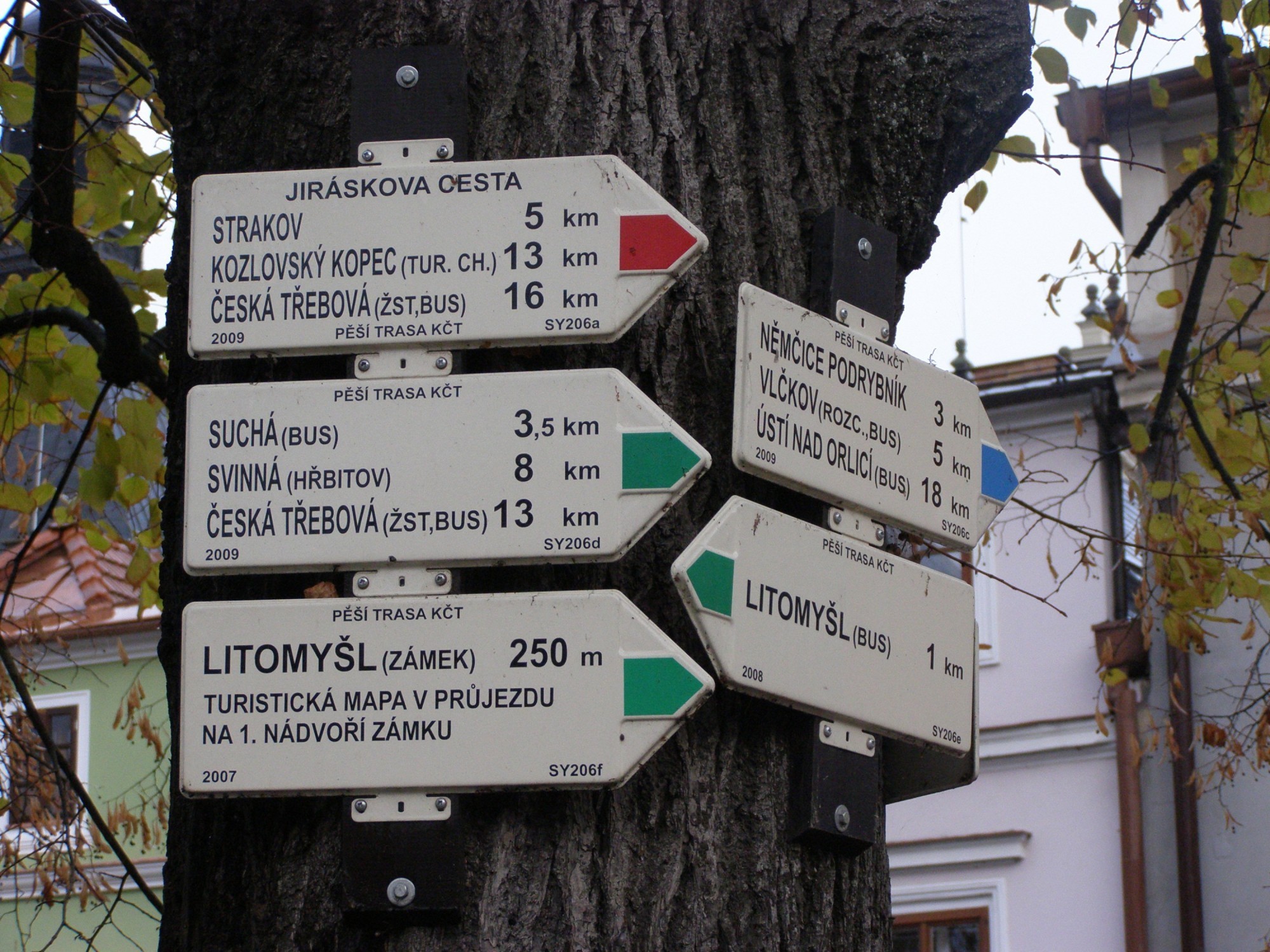 Turistický rozcestník, který se nachází v severní části Smetanova náměstí v Litomyšli, ukazuje turistům cestu do čtyř směrů. Po žluté značce ve směru Litomyšl - Šibeniční vrch, Nedošínský háj, Tržek žst, po značce červené ve směru Nové Hrady, Morašice - Strakov, Kozlovský kopec, Česká Třebová, po značce modré ve směru Litomyšl - Vlčkov, Řetová, Ústí nad Orlicí, no a po značce zelené ve směru Litomyšl bus - Suchá, Svinná, Česká Třebová.
