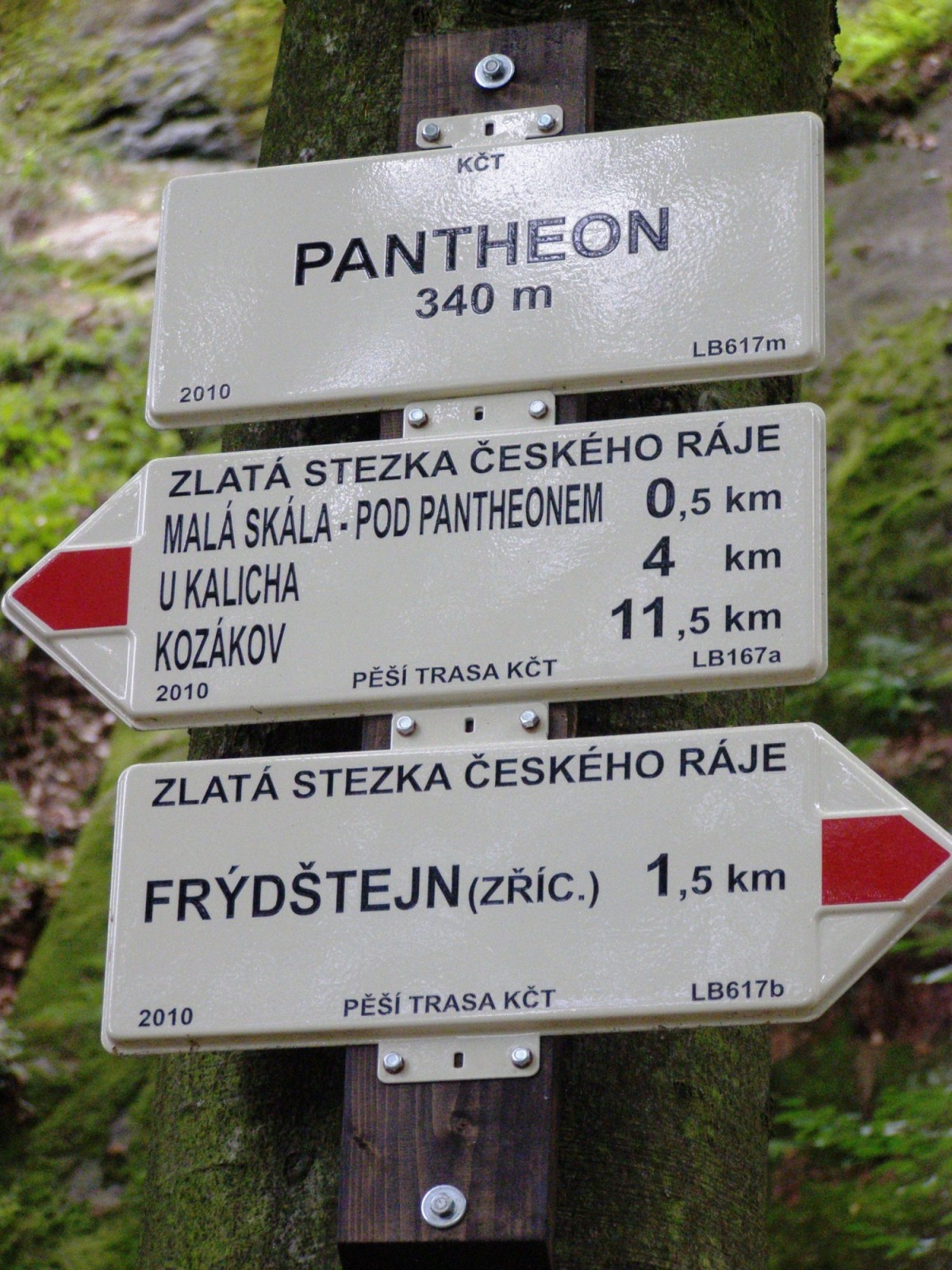 Turistický rozcestník, který se nachází na úpatí Pantheonu, ukazuje turistům cestu po červeně značené Zlaté stezce Českého ráje ve směru Turnov, Dolánky, Frýdštejn - chata U Kalicha, Koberovy, Kozákov.