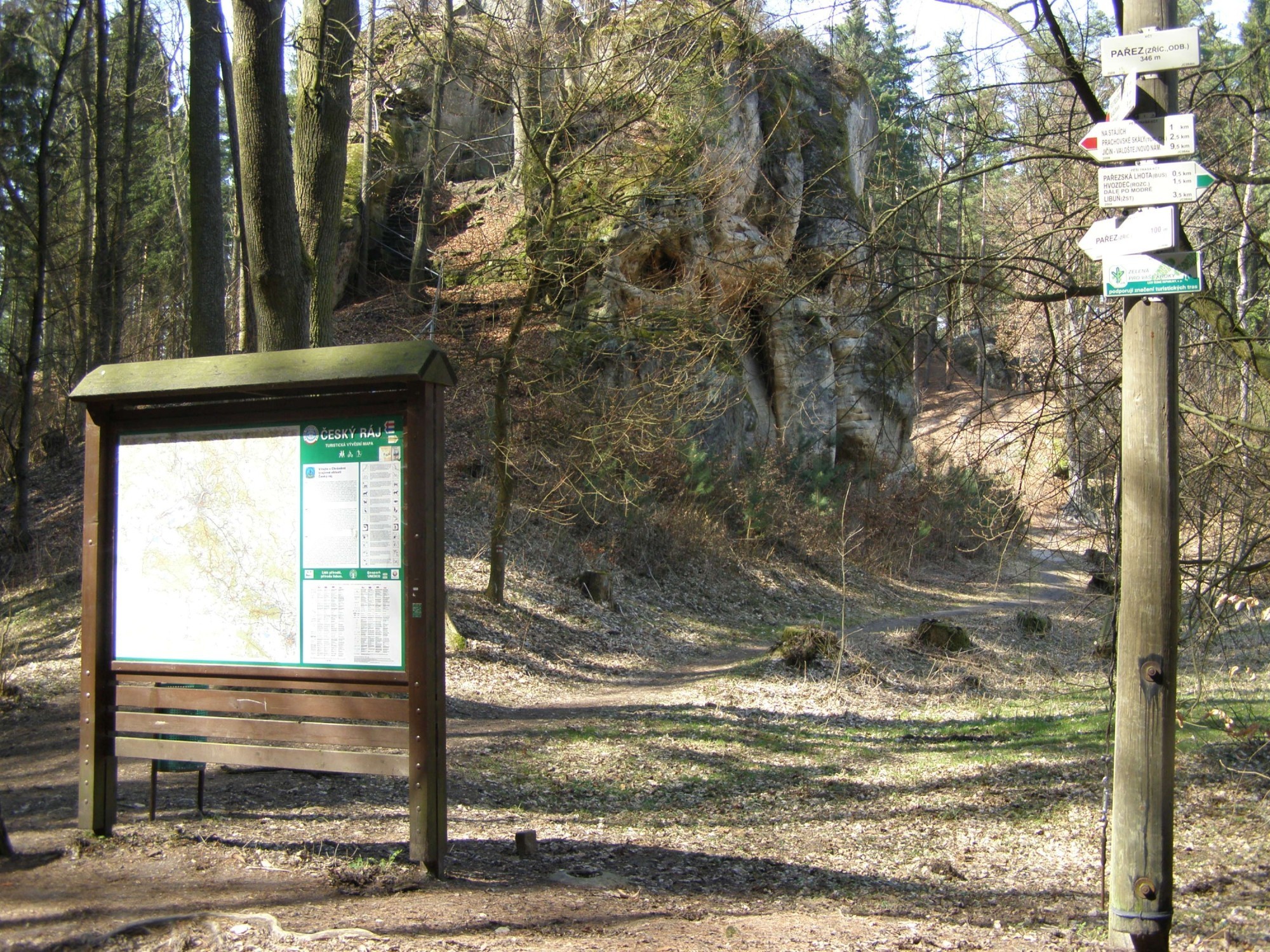 Turistický rozcestník, který se nachází u zříceniny hradu Pařez, ukazuje turistům cestu ve dcou směrech. Po zelené značce ve směru Pařez - Hvozdec (dále po modré Libuň) a po značce červené ve směru Trosky - Prachovské skály, Jičín.