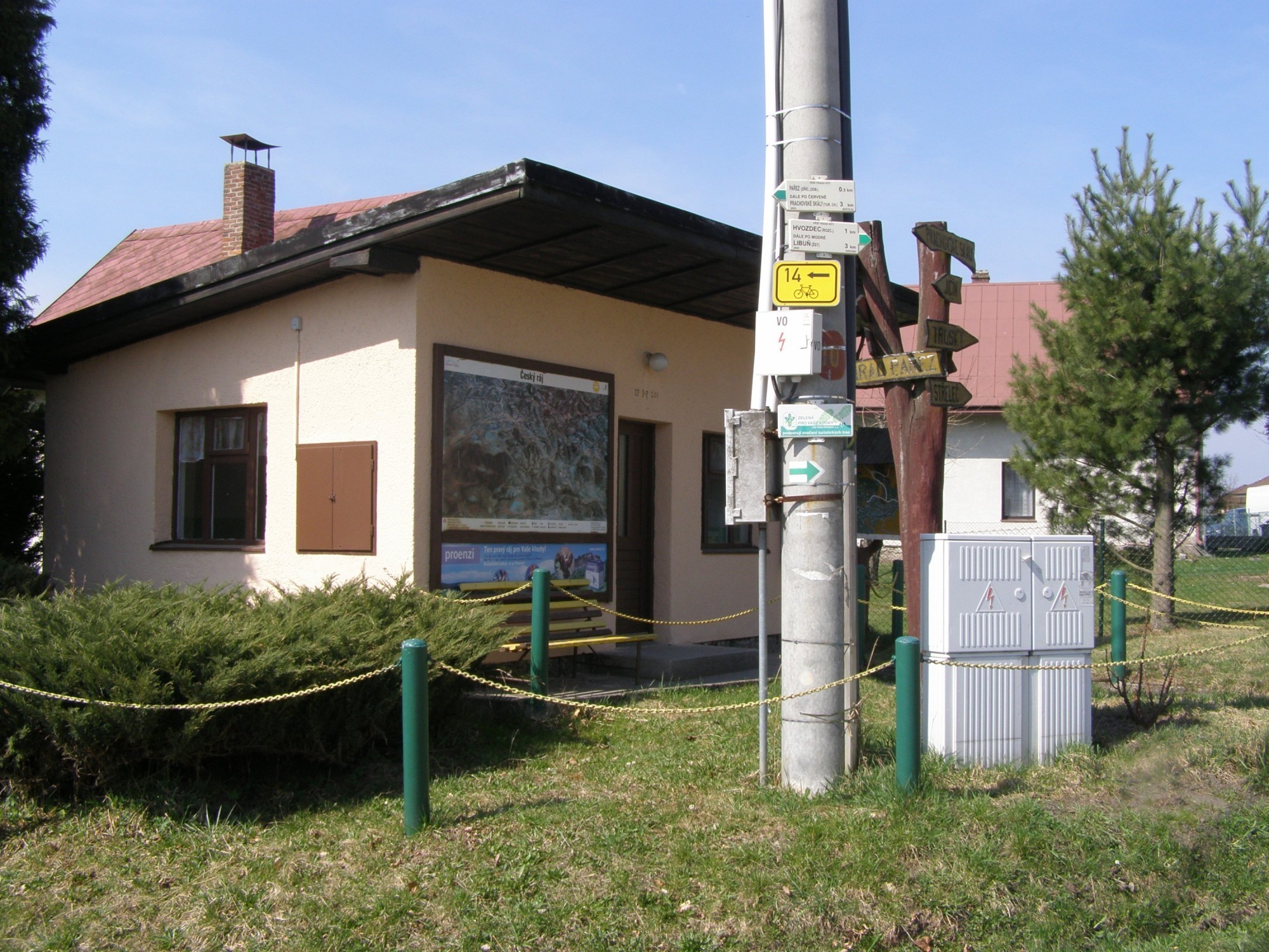 Turistický rozcestník, který se nachází u autobusové zastávky v Pařezské Lhotě, ukazuje turistům cestu po zelené značce ve směru zřícenina hradu Pařez - Hvozdec (dále po modré Libuň).