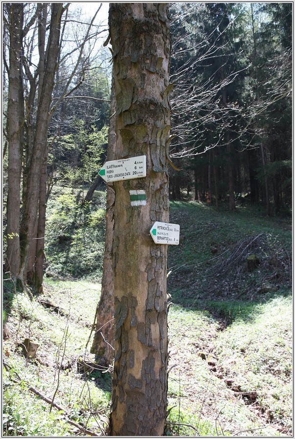 Směrníky na stromě přímo u železniční zastávky Petríkovice ukazují průběh zelené značky z Petříkovic na hřeben Jestřebích hor - bunkr nad Slavětínem, Paseka, Žaltman, Kolčarka, Odolov, Kryštofovy kameny, Švédský vrch, Turov.