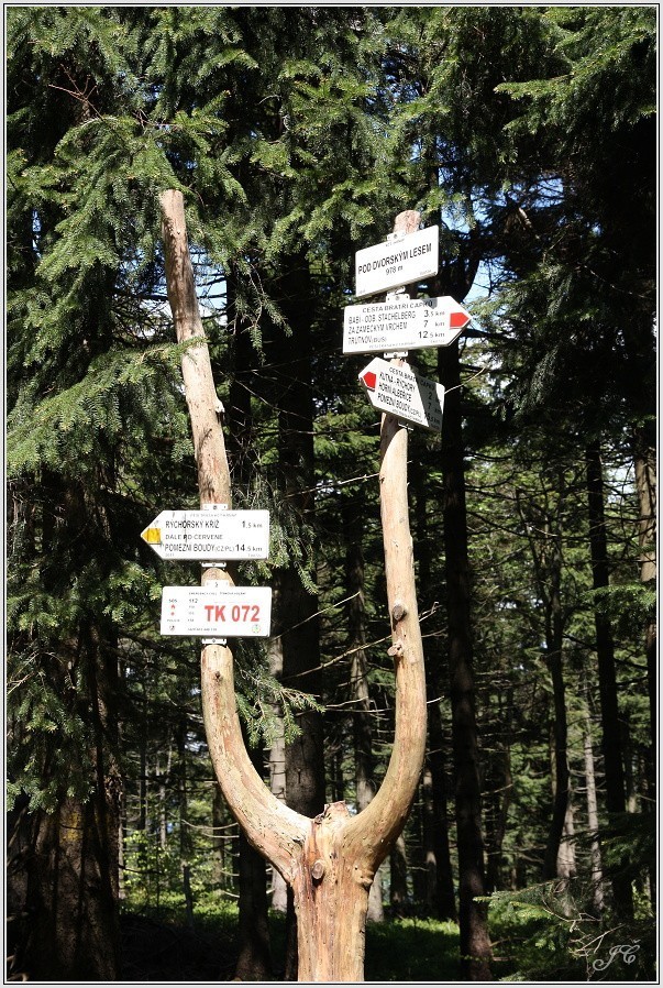 Turistické rozcestí leží na okraji lesa u Rýchorského kříže. Procházejí tudy tyto značené trasy: