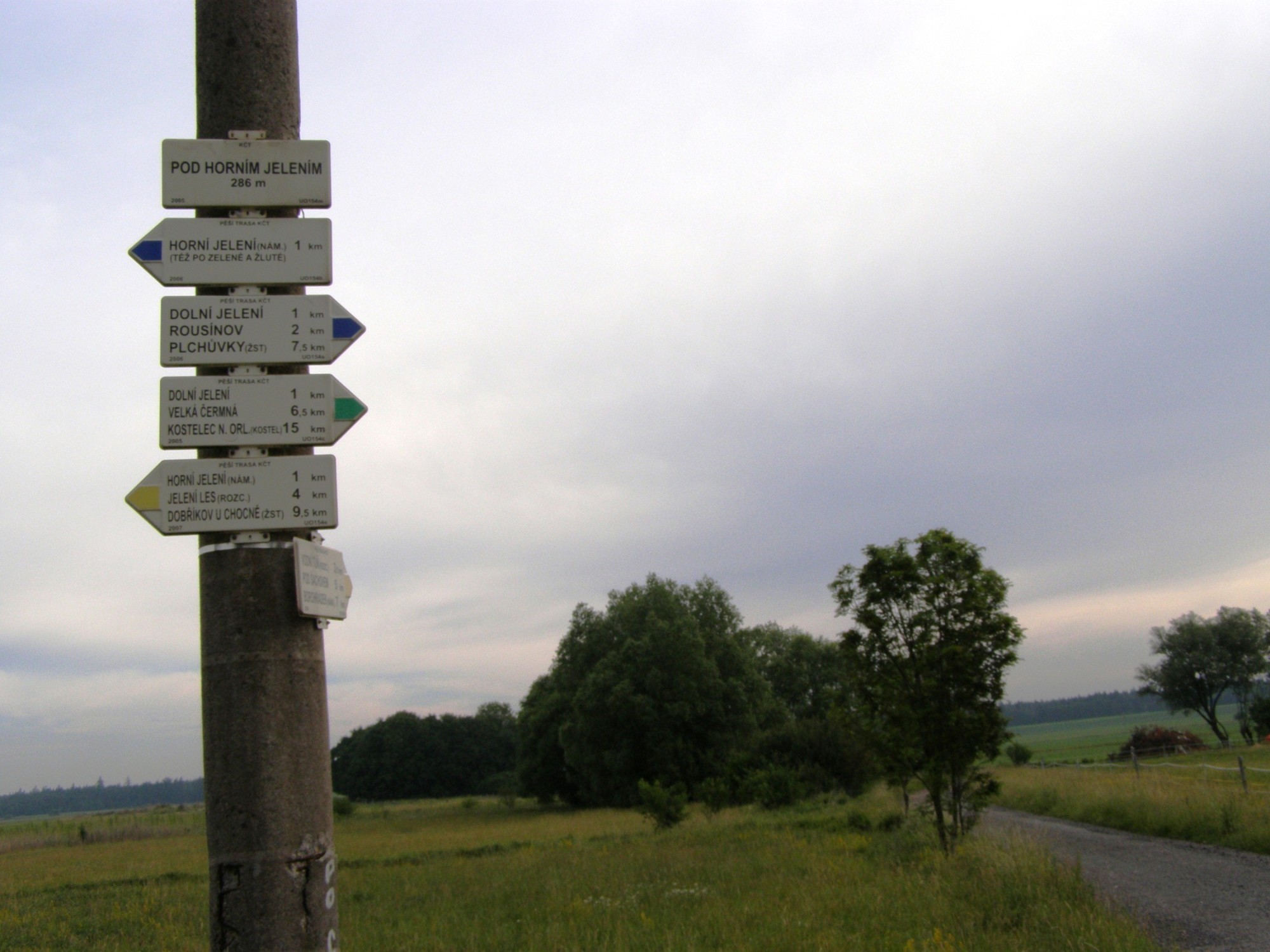 Turistický rozcestník, který se nachází cca 500 metrů od centra Horního Jelení, ukazuje turistům cestu do tří směrů. Po značce modré ve směru Suté Břehy, Poběžovice, Holice, Vinice, Horní Jelení - Dolní Jelení, Rousínov, Plchůvky žst., po značce zelené ve směru Horní Jelení - Dolní Jelení, Velká Čermná, Sklenářka, Kostelec nad Orlicí a po značce žluté ve směru Dobříkov u Chocně, Jelení les, Horní Jelení - Vodní tůň, Pod Šachovem, Borohrádek.