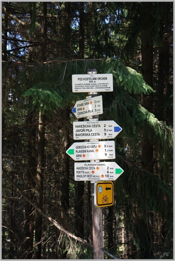Turistický rozcestník najdeme přímo na břehu Vchynicko-tetovského kanálu. Prochází tudy modře značená trasa z Čeňkovy pily u Vydry a ze Srní pod Tříjezerní slať, k Javoří Pile, na Oblík a dále do Dobré Vody, Hartmanic a Rejštejna. Rovněž tudy prochází zeleně značená cesta (zároveň Naučná stezka Vchynicko-Tetovský plavební kanál) ze Vchynice přes Mechov a Sedelský vrch do Srní.