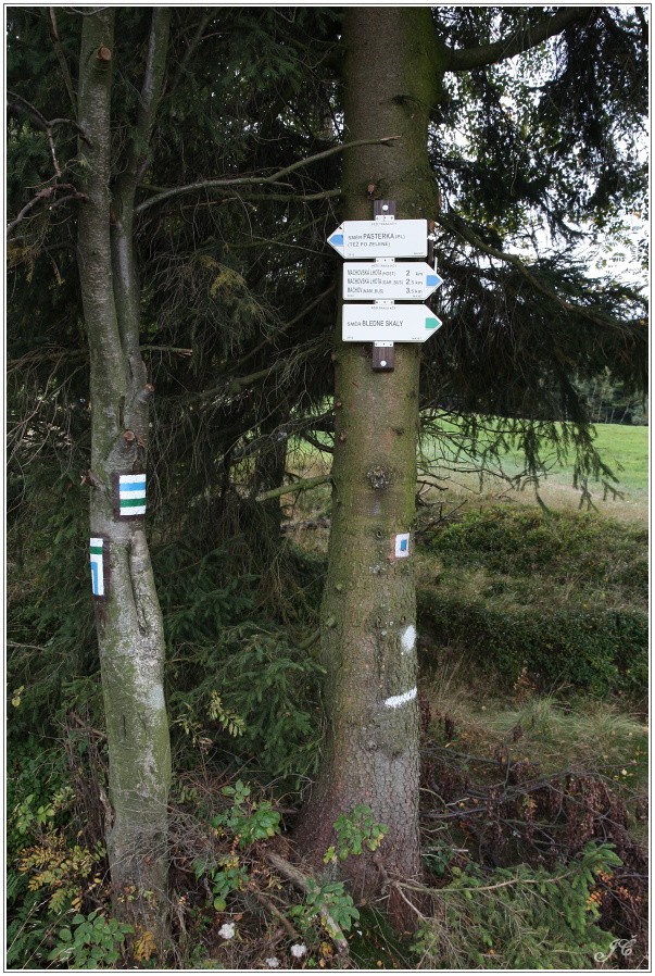 polská modrá SV směrem - Pasterka, Machovský kříž (navazují české turistické značky červená a modrá)