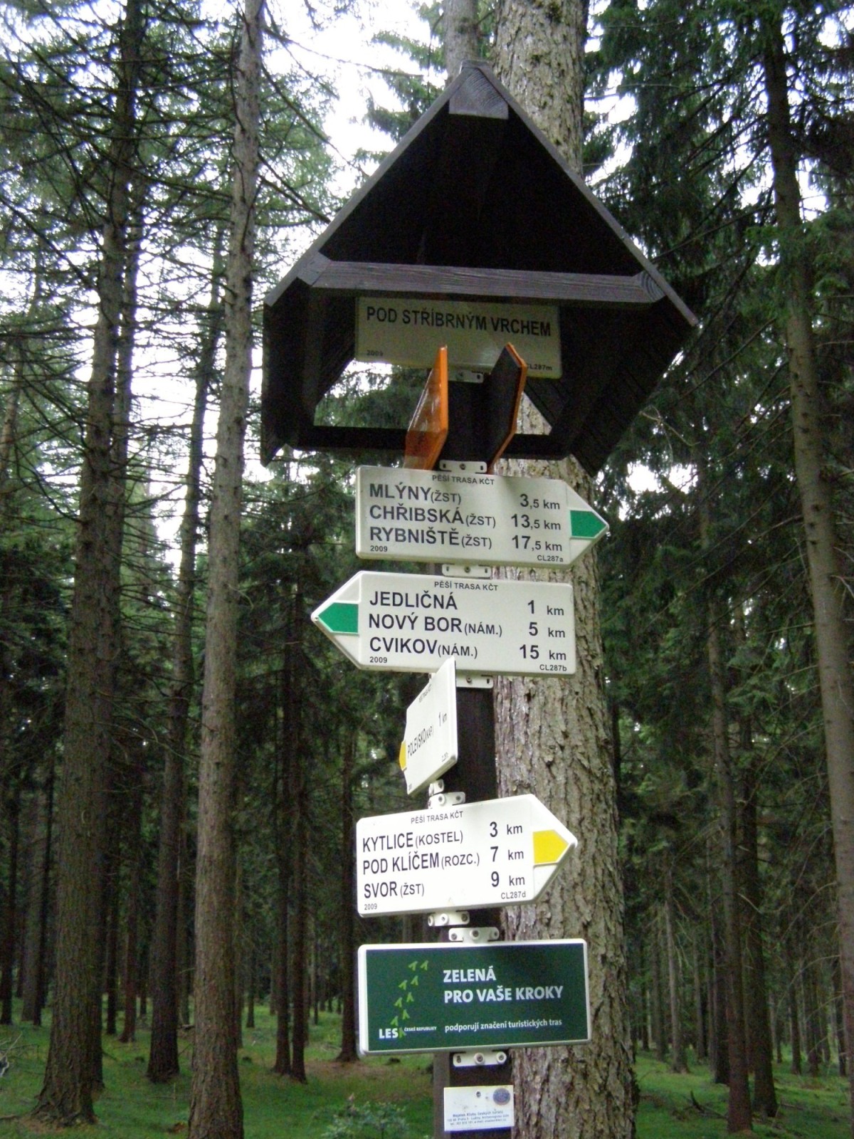 Turistický rozcestník, který se nachází v lokalitě Pod Stříbrným vrchem, ukazuje turistům cestu do dvou směrů. Po zelené značce ve směru Rybniště, Chřibská, Mlýny, Jedličná - Nový Bor, Půlnoční stráň, Havraní skály, Údolí samoty, Cvikov a po značce žluté ve směru Polevsko - Kytlice, Pod Klíčem, Svor.
