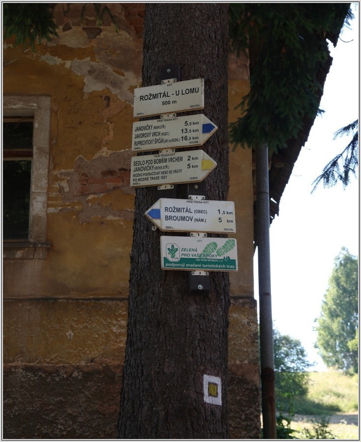 Rozcestí (foto 1) leží nad horním (severním) koncem Rožmitálu u kamenolomu. Modrá značka odtud vede na hřeben Javořích hor k Třípanskému kameni (foto 2), sestupuje do Janoviček (foto 3), vrací se zpět na hřeben a přes Ruprechtický Špičák (foto 4) míří do Meziměstí. Opačným směrem vede přes obec Rožmitál (foto 5) do Broumova (foto 6 a 7). Směrník se žlutou značkou již zde není, úsek žluté k rozcestí Rožmitál, Nad lomem je zrušen a žlutá značka dnes vede z Janoviček do Šonova.