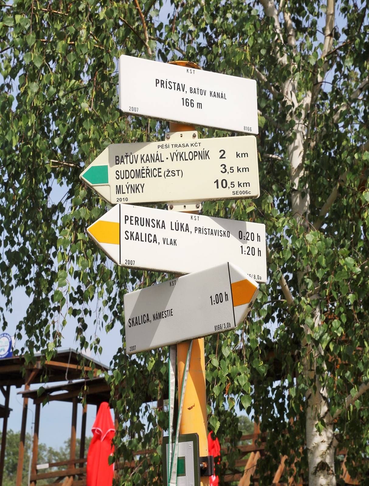 Turistické rozcestí se nachází u přístavního objektu na Baťově kanálu u Skalice. Prochází tudy žlutě značená turistická cesta a začíná zde i zelená značka. Žlutá vede jedním směrem do Skalice na náměstí, opačným směrem na Perunskou louku k odbočce k přístavu a dále kolem Skalického rybníku se vrátí zpět do Skalice k železniční stanici. Zde začínající zelená značka přechází u stavidel na moravskou stranu a kolem Baťova kanálu dojde k Výklopníku a dále pak k železniční stanici Sudoměřice nad Moravou. Na slovenských směrovkách jsou údaje v hodinách, na směrovce směřující na českou stranu pak v kilometrech.