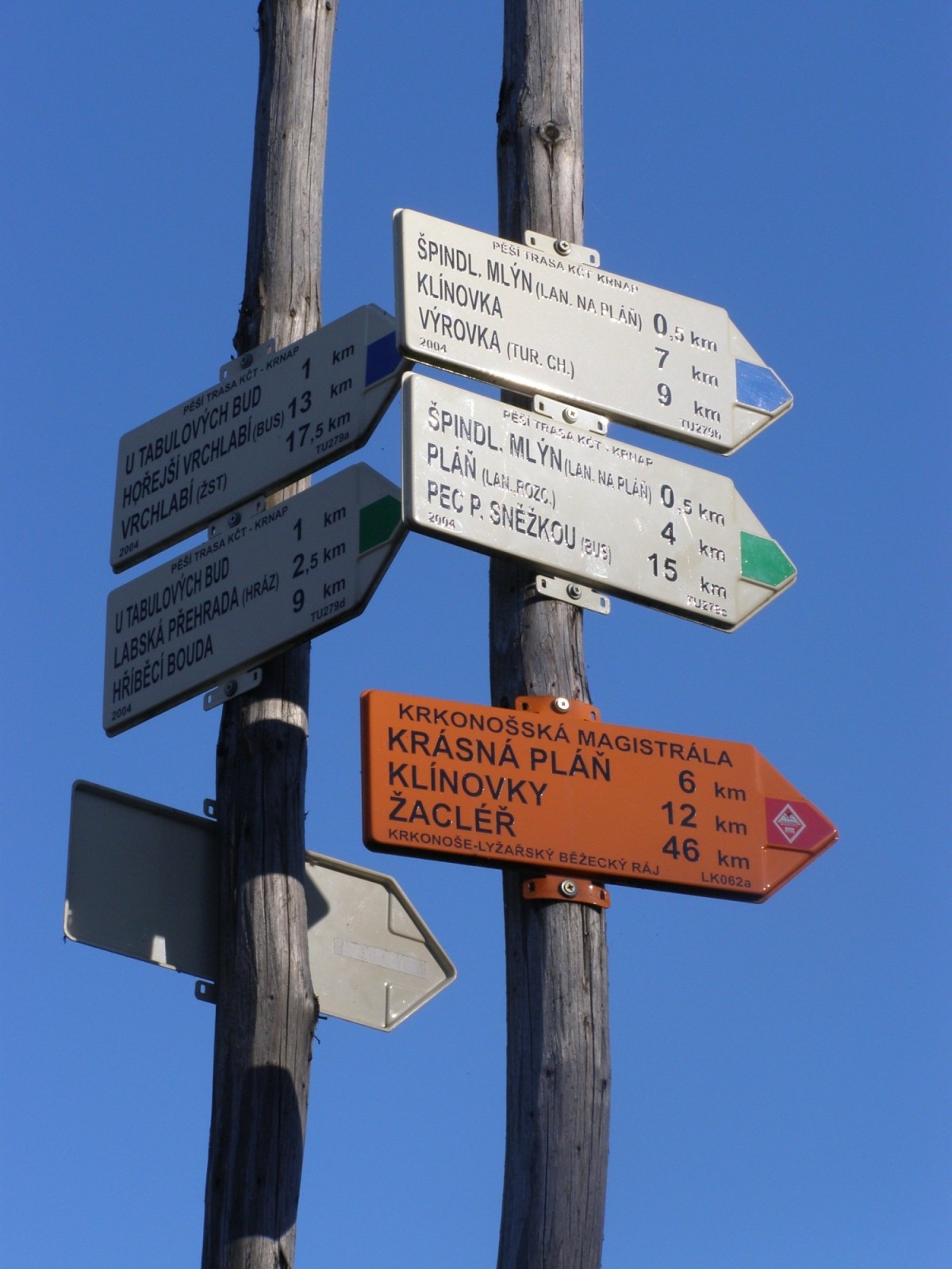 Turistický rozcestník, který se nachází u infocentra ve Špindlerově Mlýně, ukazuje turistům cestu do více směrů. Po značce modré ve směru Vrchlabí, Hořejší Vrchlabí, Herlíkovice, Přední Labská - Klínové boudy, Výrovka, po značce zelené ve směru Hříběcí bouda, Michlův mlýn, Labská přehrada - Hromovka, Pláně, Výrovka, Pec pod Sněžkou a po značce žluté ve směru Špindlerův Mlýn - Hromovka, Strážné, Vrchlabí. Oranžovým směrníkem je značena Krkonošská lyžařská magistrála.