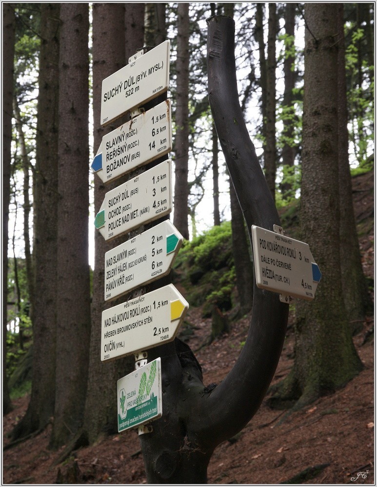 Rozcestí (foto 1) se nalézá nad obcí Suchý Důl (https://www.turistika.cz/mista/suchy-dul-a-slavny) u ústí Hruškovy rokle (https://www.turistika.cz/mista/hruskova-rokle-v-broumovskych-stenach). Značené trasy: