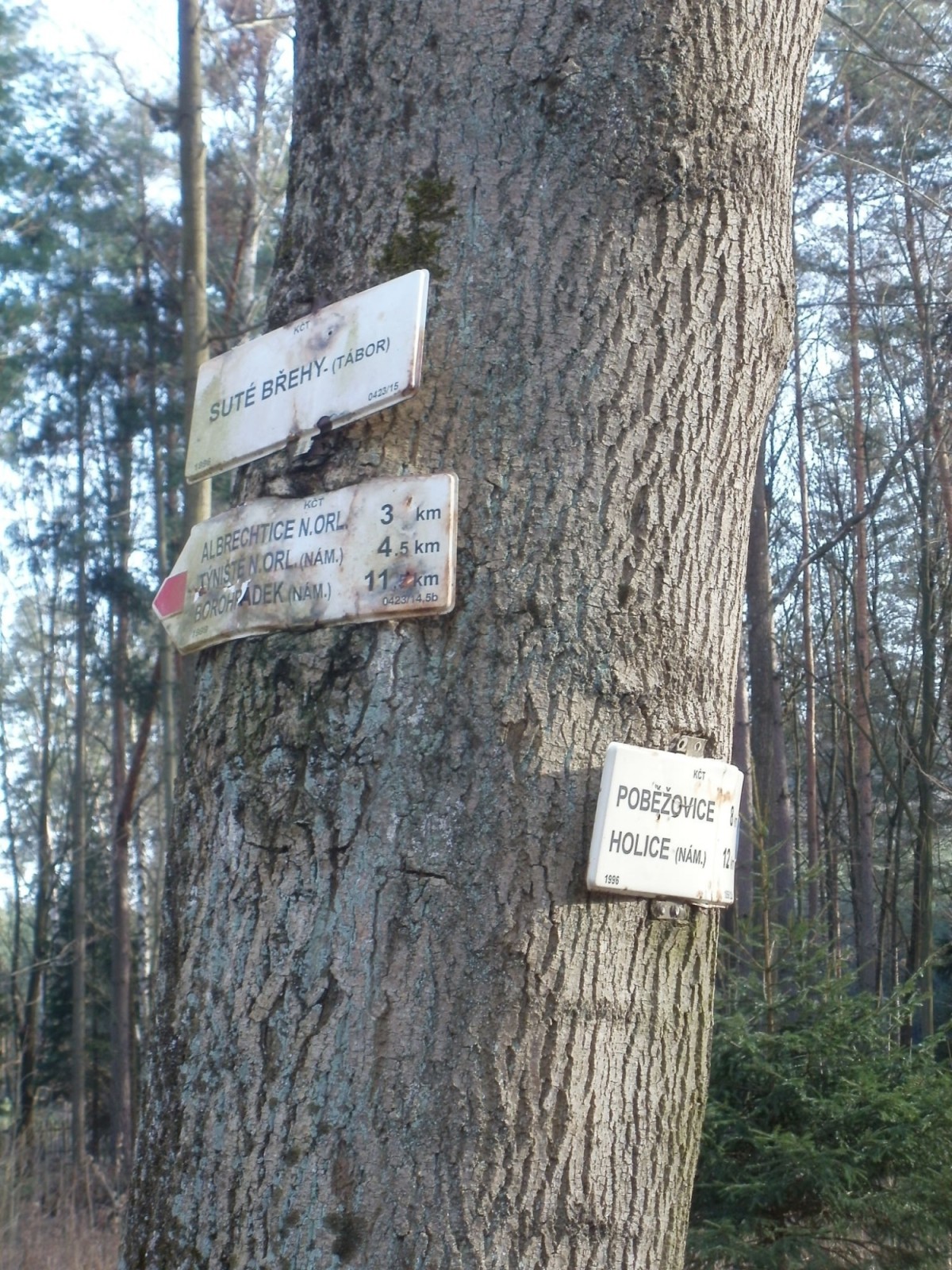 Turistický rozcestník, který se nachází u tábora u Sutých břehů ukazuje turistům cestu do dvou směrů. Po červené značce ve směru Nový Hradec Králové - Týniště nad Orlicí a po značce modré ve směru Suté Břehy – Holice a dále Horní Jelení. Toto rozcestí se nachází cca 200 metrů pod rozcestím Suté břehy, které je popsáno zde: https://www.turistika.cz/mista/turisticke-rozcesti-sute-brehy