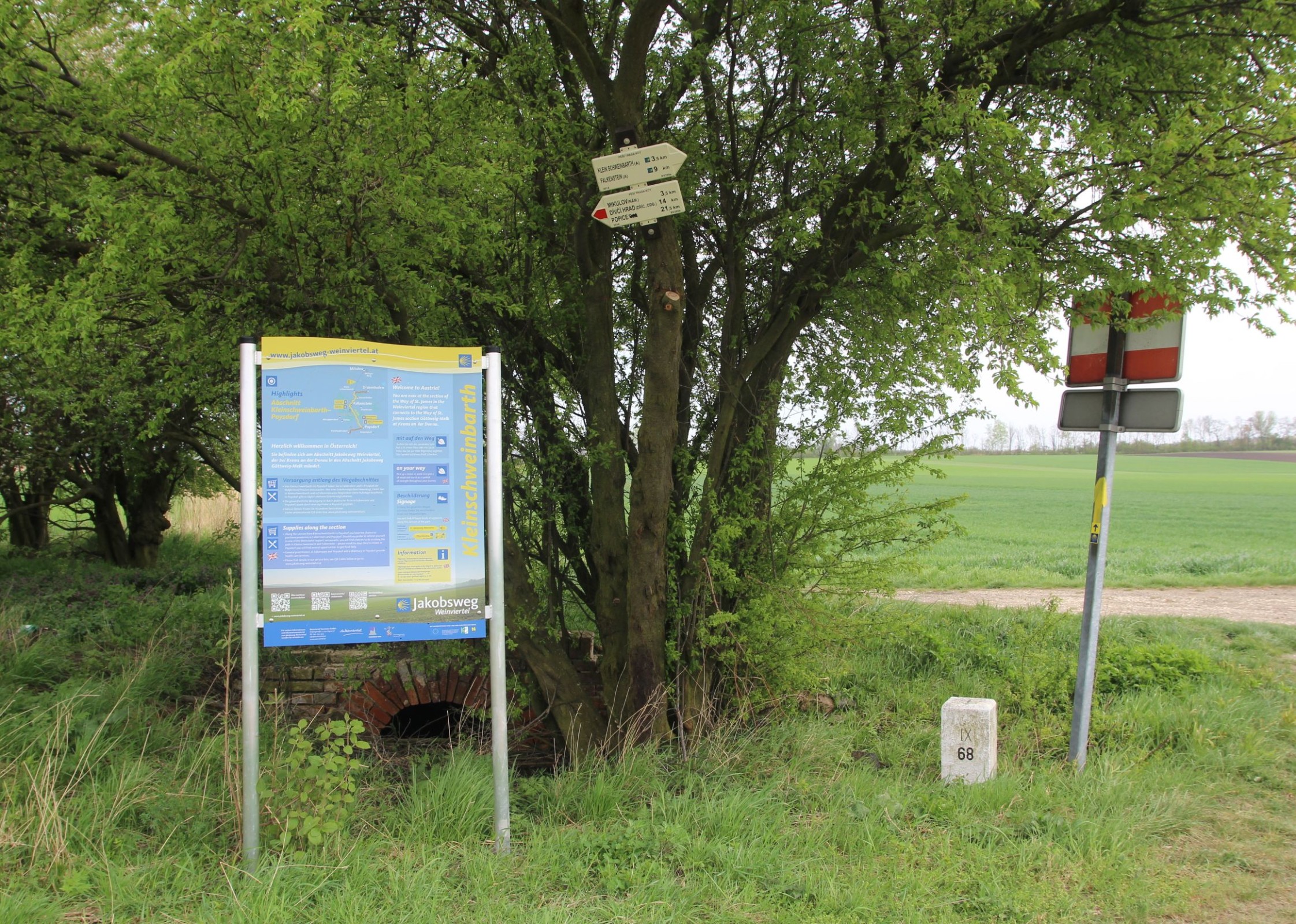 Dolních Věstonic a dále přes Strachotín k vlaku do Popic. Na rakouské straně pak po směrovkách Jakobsweg se znakem mušle hřebenatky směřuje do obcí Kleinschweinbarth a Falkenstein.
