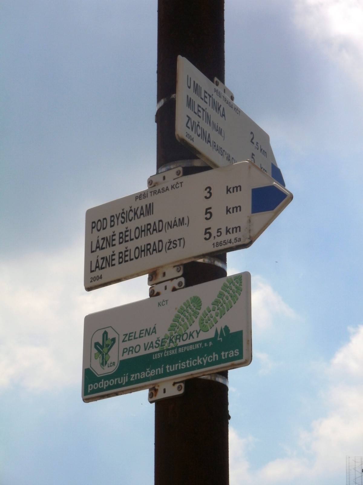 Turistický rozcestník, který se nachází u hospody Dupačka v Tetíně, ukazuje turistům cestu po modré značce ve směru Lázně Bělohrad - Miletín, Zvičina.